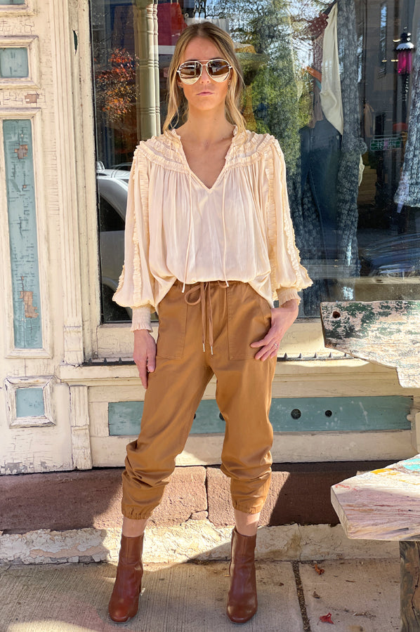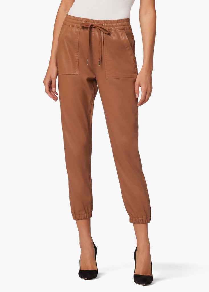 The tapered leg and pull on waistband make the Sienna jogger comfortable. The pressed and coated fabric in rich hues with leather-like sheen make these joggers noticeable. Style with heels for a night out or pair with sneakers for an afternoon lunch.