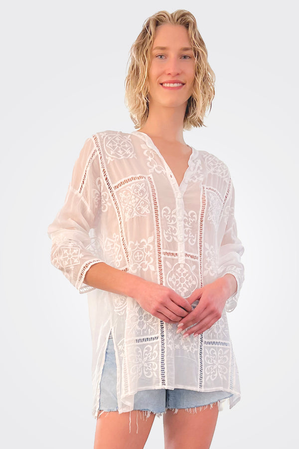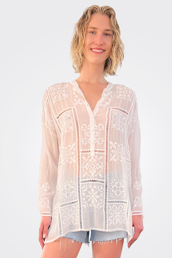 Johnny Was is built on the foundation of bold creativity—rich prints, embroidered details, patchwork motifs, and fabric that feels luxurious. The label combines resort ease with bohemian soul: maxi dresses that sway in the breeze, scarves you wrap or accent, tops with dramatic sleeves, and accessories that complete the look. These aren’t just clothes—they’re wearable art made with quality in every stitch.