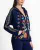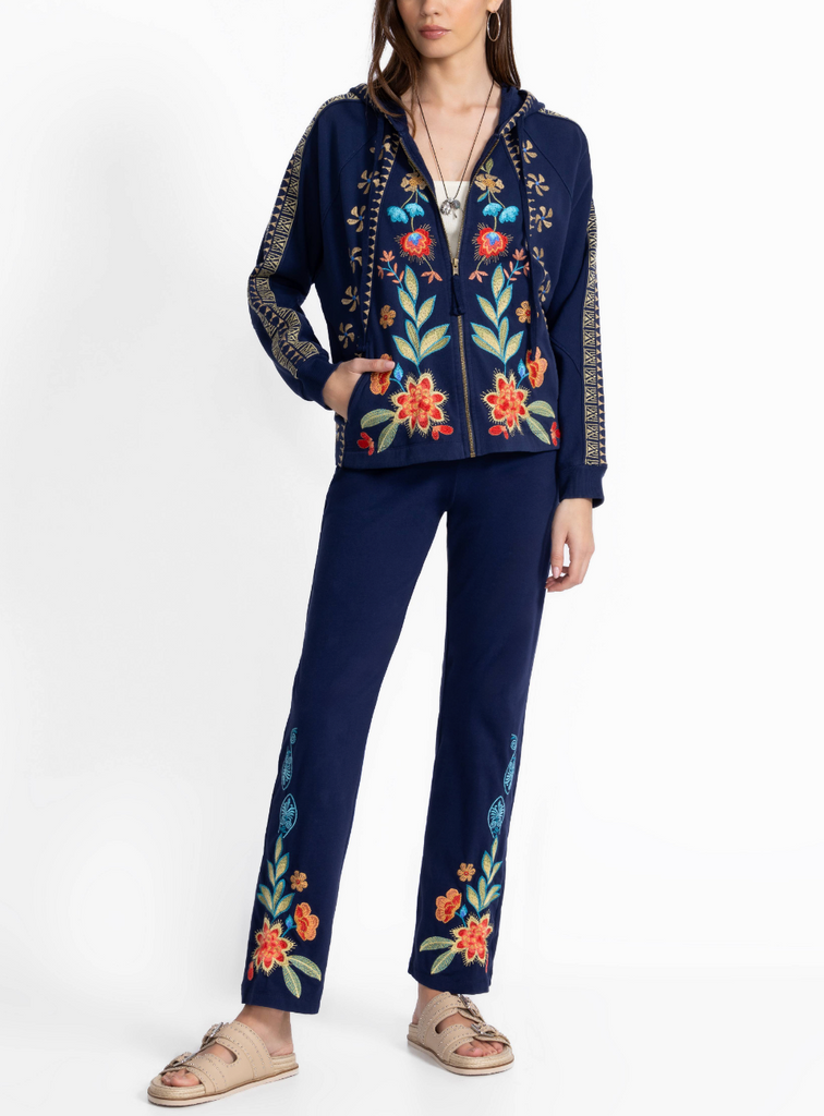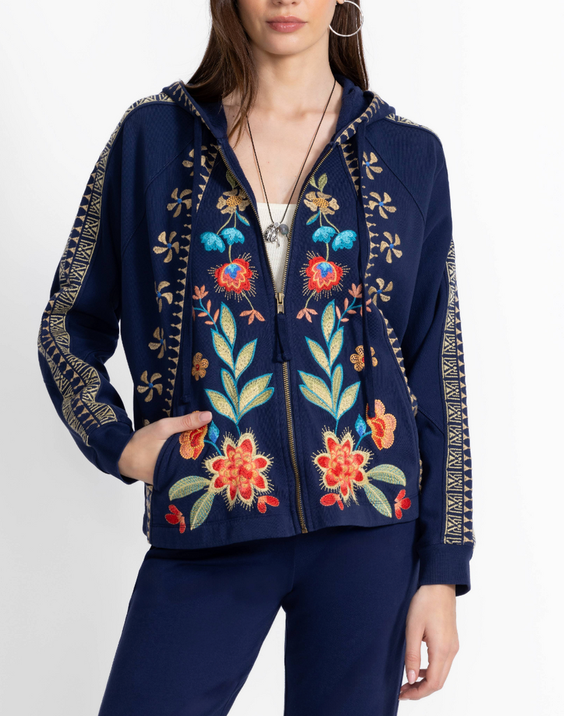 Crafted from 100% cozy cotton, the Akari Dolman Seamed sweatshirt is embellished with beautiful intricate seaming. Designed with a hooded zip-front closure Raglan sleeves, this unique hoodie is adorned with bold floral embroidery in a kaleidoscope of brilliant color. Pair with the Akari Baby Boot Leggings and fashion sneakers for a perfectly coordinated look.