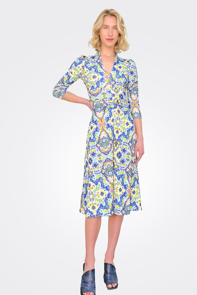 Adorned with eye-catching color and pattern, the Kiara Matte Jersey Tea Length Dress is crafted from a dreamy stretch matte jersey. Featuring a V-neckline with a hidden zipper at the back, this dress offers a fitted bodice and an A-line tea-length skirt perfect for any occasion. Pair with wedge espadrilles and a linen bag for lunch with friends.
