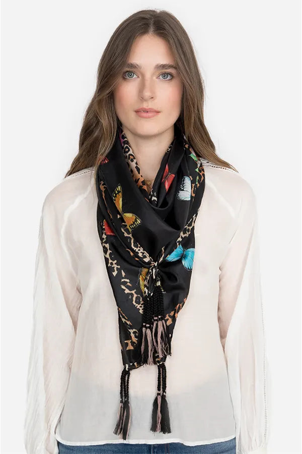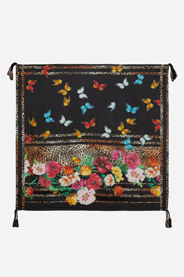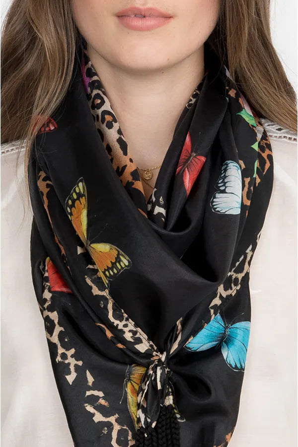 The gorgeous butterfly design combined with the lush florals of our Sandra Scarf makes it the perfect piece to tie any look together. A reimagined classic — wear it kerchief-style around your neck or draped loosely across your shoulders. You can also tie it to the strap of your favorite leather bag for an elegant pop of color.