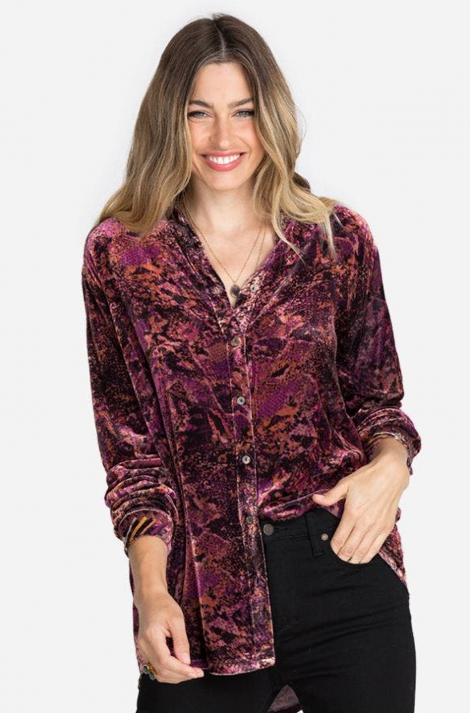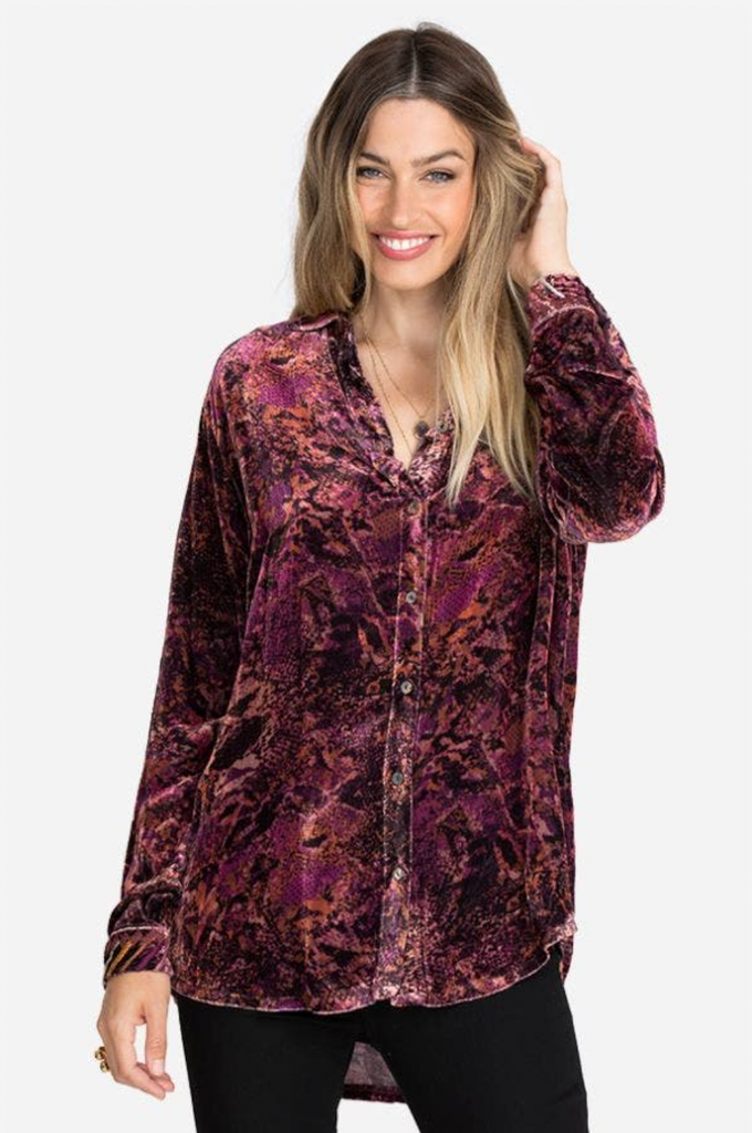 The soft fabrication and effortless silhouette of Scarlet Cobra Velvet Oversized Shirt make it seamlessly comfortable, while the gorgeous floral detailing and button-down design add a touch of boho flair. Pair it with your favorite denim or leggings and sandals or flats for a chic, laid-back look — or dress it up with a satin skirt and booties.
