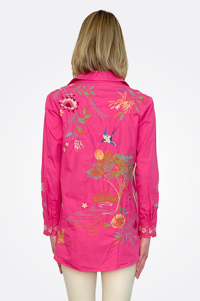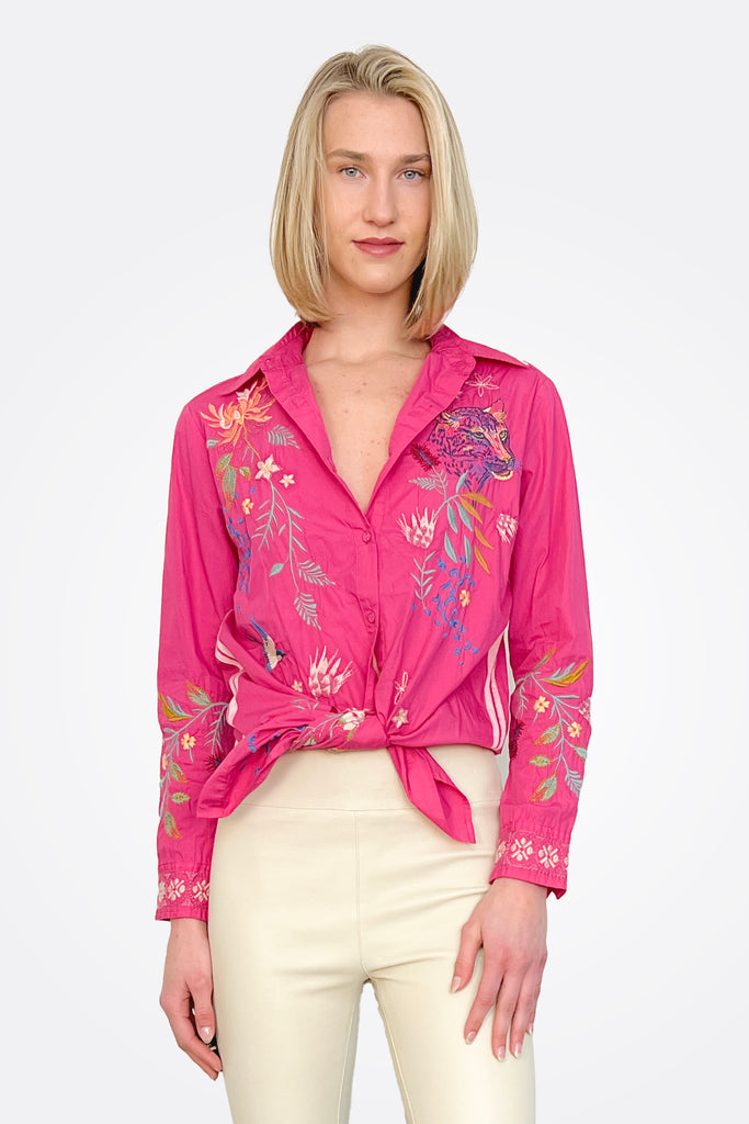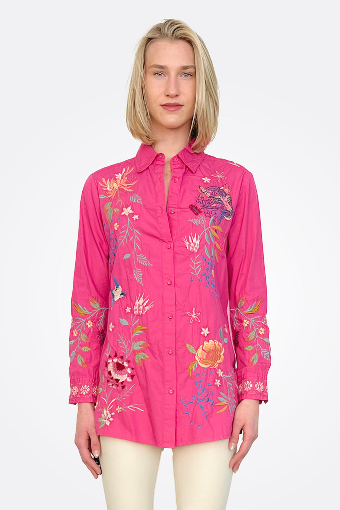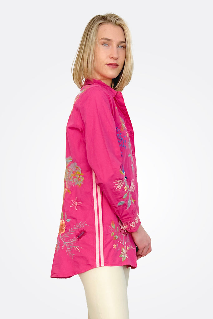 Expertly combining stripes and delicate blooms, the Indalo Button Down Shirt Tunic offers visual interest and texture. Crafted from a flowing cotton blend and detailed with intricate placement embroidery, this shirt gives new life to a classic silhouette. Pair with relaxed jeans and fashion sneakers for a casual weekend look.
