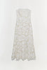 The Valletta Strapless Embroidered Dress in White Multi. This strapless bustier midi is adorned with intricate abstract floral embroidery. The design captures a delicate yet striking aesthetic with a fitted silhouette that flows into a flared hemline.