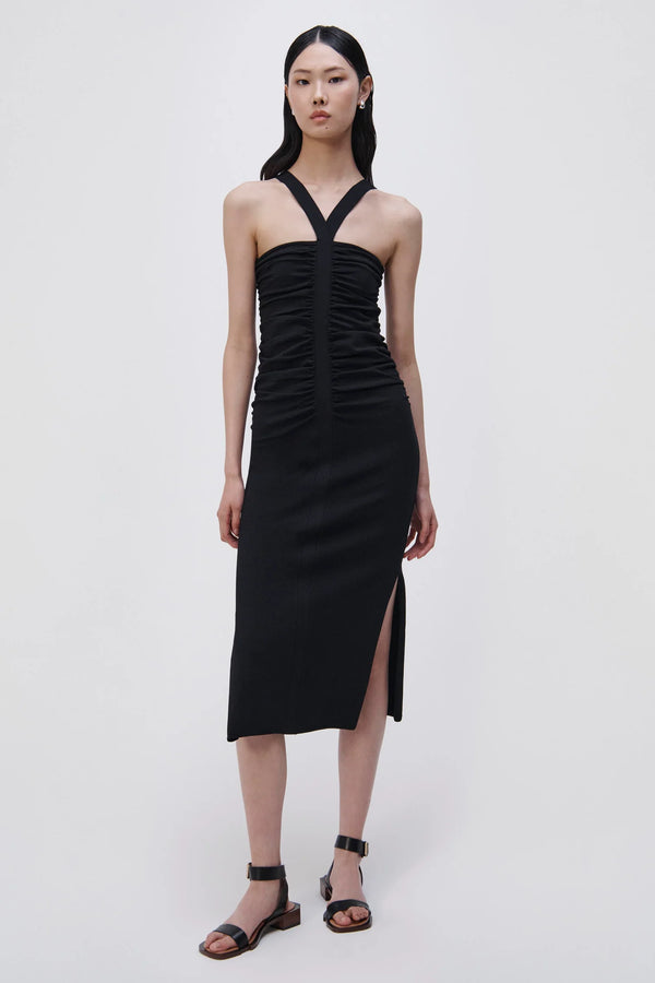 Every piece highlights the brand’s signature tension between strength and sensuality. Think draped Angeline Draped Midi Dress in Dried Pineapple, engineered with structured dimension and sleek cocktail crepe detailing, or the Cillian Straight Leg Pant, tailoring that balances relaxed ease with sculptural precision. Soft Theodora Bustier Tops, versatile swimwear, and drawn silhouettes create a cohesive wardrobe built around architectural fashion.