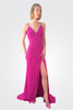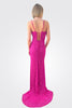 Details: Fully sequin prom dress, form-fitting silhouette, floor length skirt with small train and high slit, spaghetti strap sleeveless bodice with V neck and open tie back.
