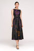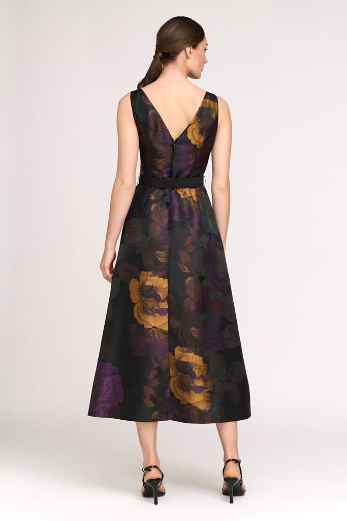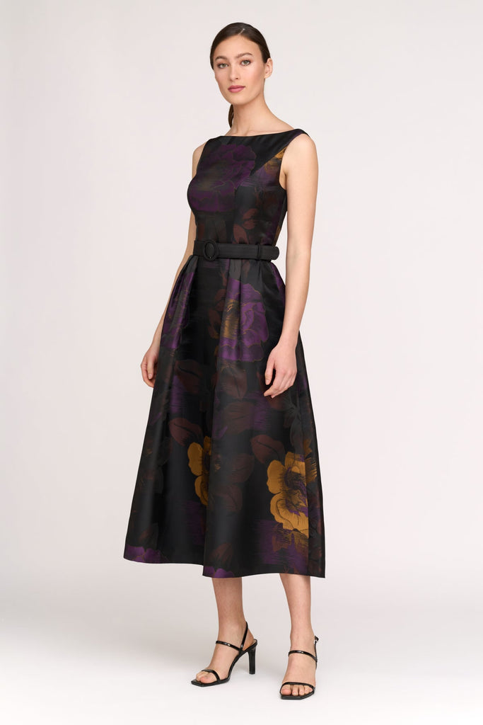 A fresh take on the best-selling Ilsa silhouette, this pleated tea-length cocktail dress is crafted from a lightweight striated floral jacquard that feels soft to the touch. The sleeveless design, featuring a sophisticated bateau neckline, elegantly highlights the shoulders, making it an effortless choice for any special occasion.