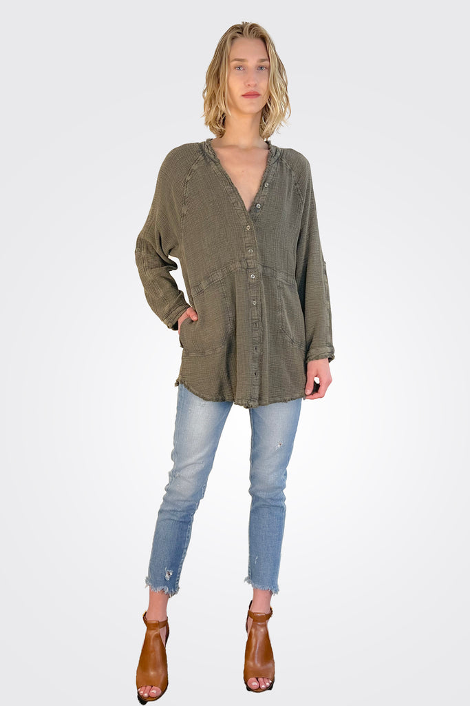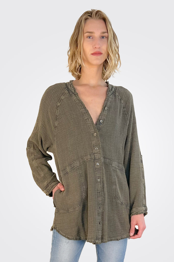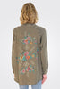 The Fleur Tunic features a long sleeve, button-up tunic with a beautiful, unique multi-colored embroidered details on the back.