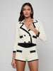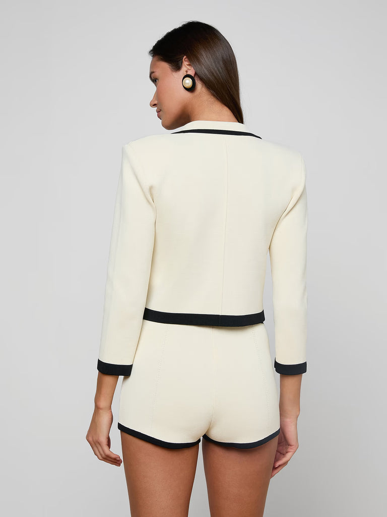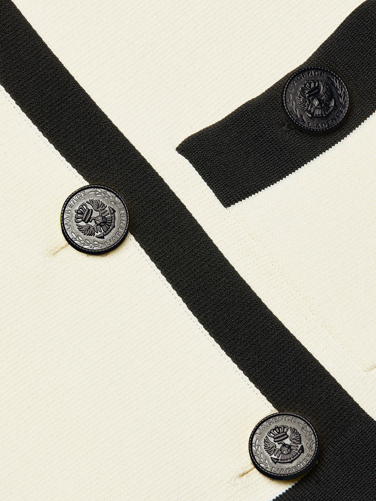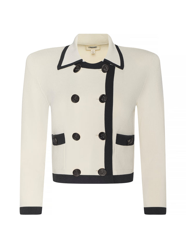 This style was featured in our Spring 2026 NYFW presentation, After Hours. The Janu knit jacket offers modern polish with vintage sophistication. Crafted in a smooth knit, it features contrast trims and a double-breasted front. Style it solo as a top or layer over your favorite tees.
