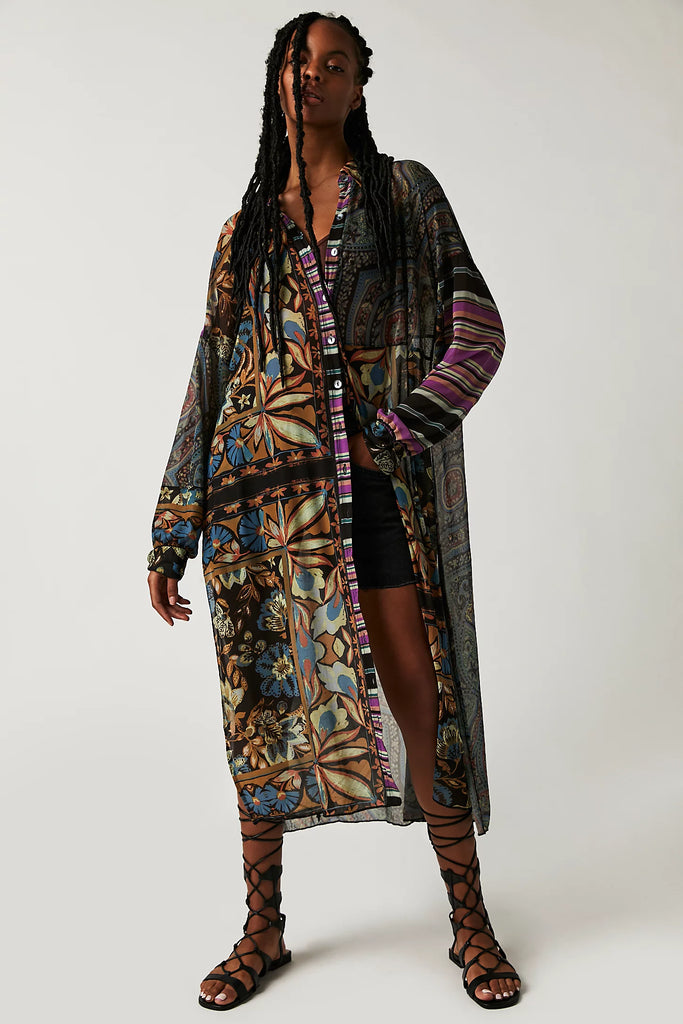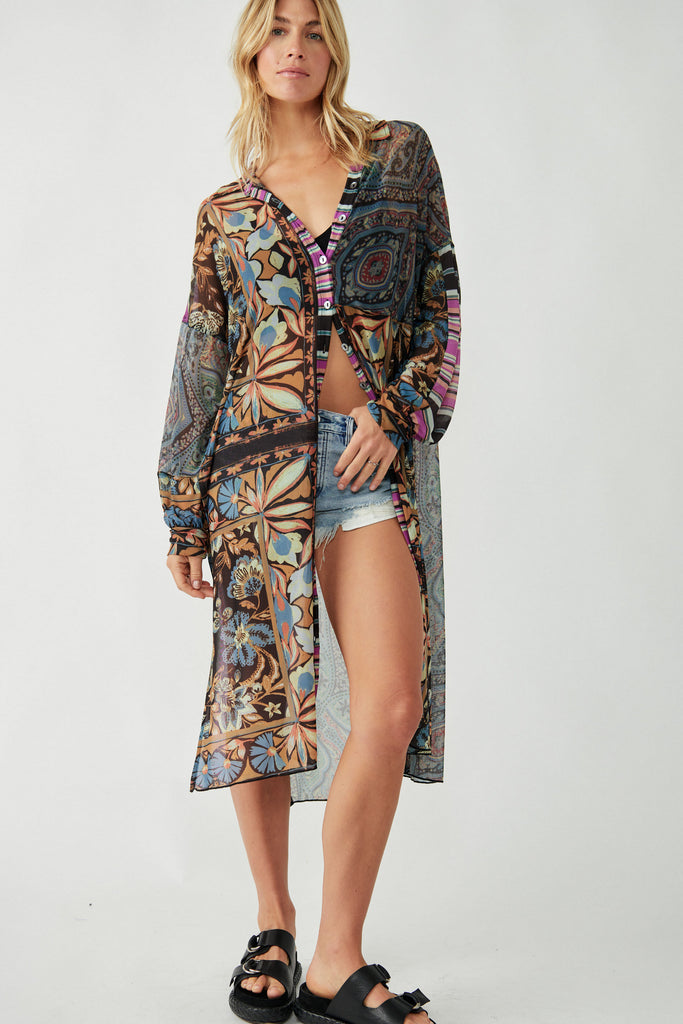 Pieced to perfection, this printed maxi top is featured in a forever classic button-front silhouette for timeless versatility from season to season.