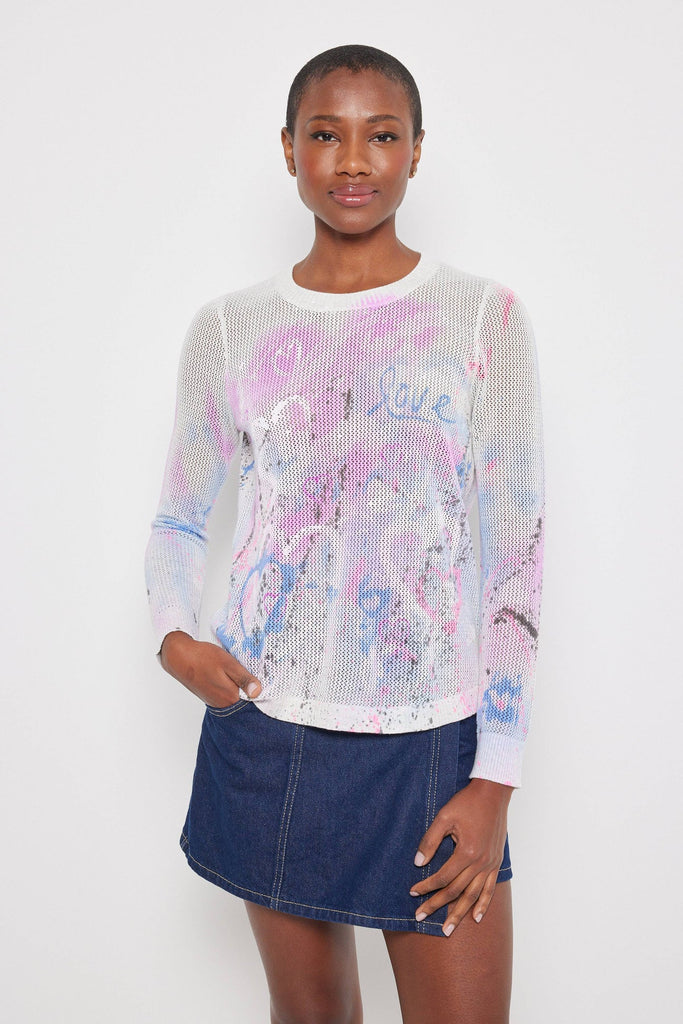 The Spring Love lightweight Cotton open stitch sweater features our message of love with an exclusive LISA TODD artisan print.
