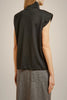 Lurex jersey top, high neck, armholes, shoulder pads, straight hem.