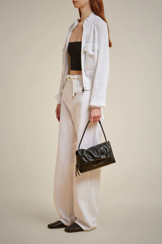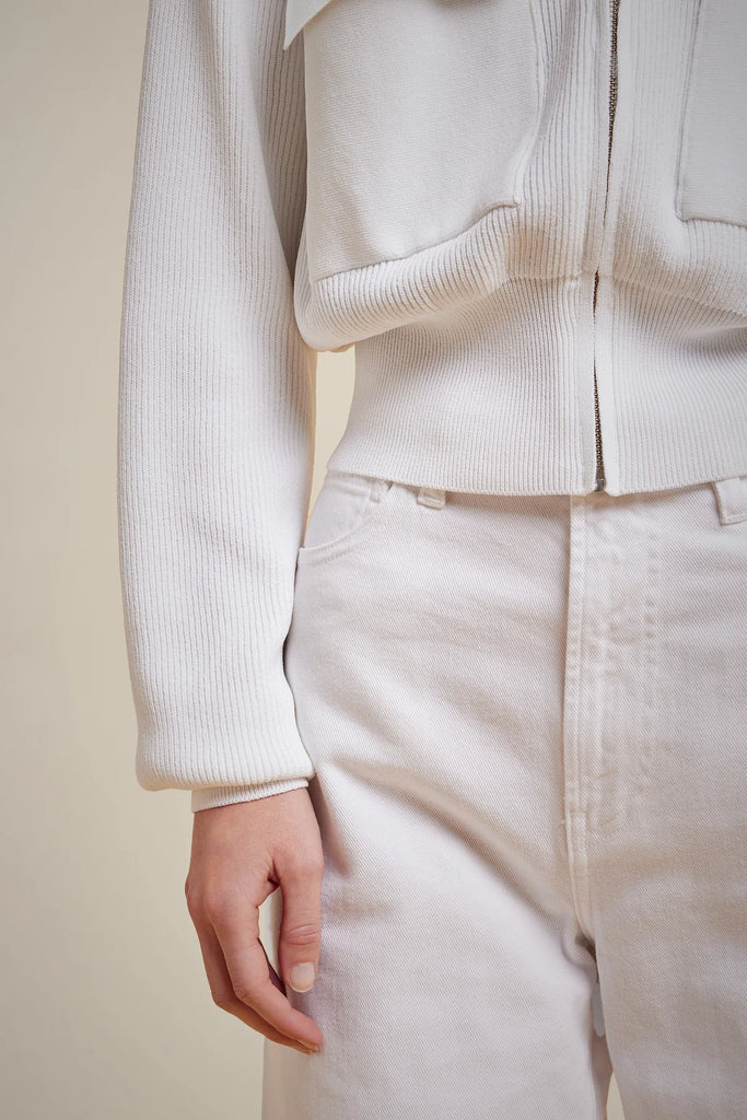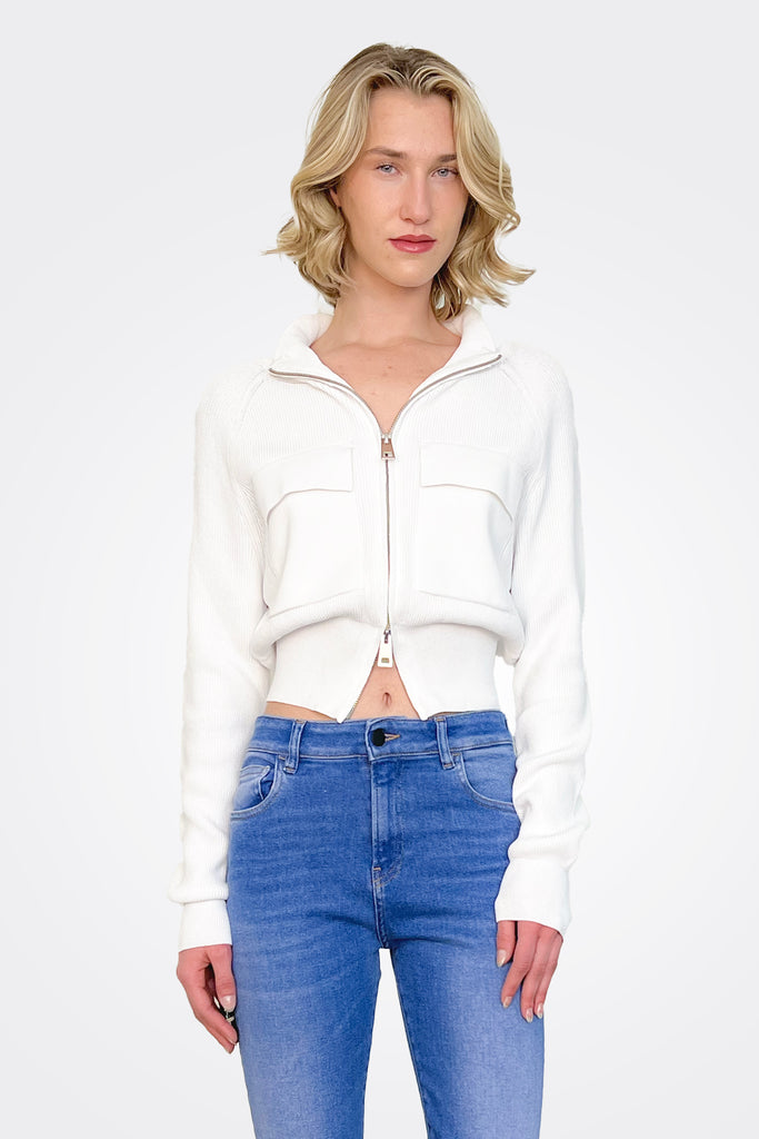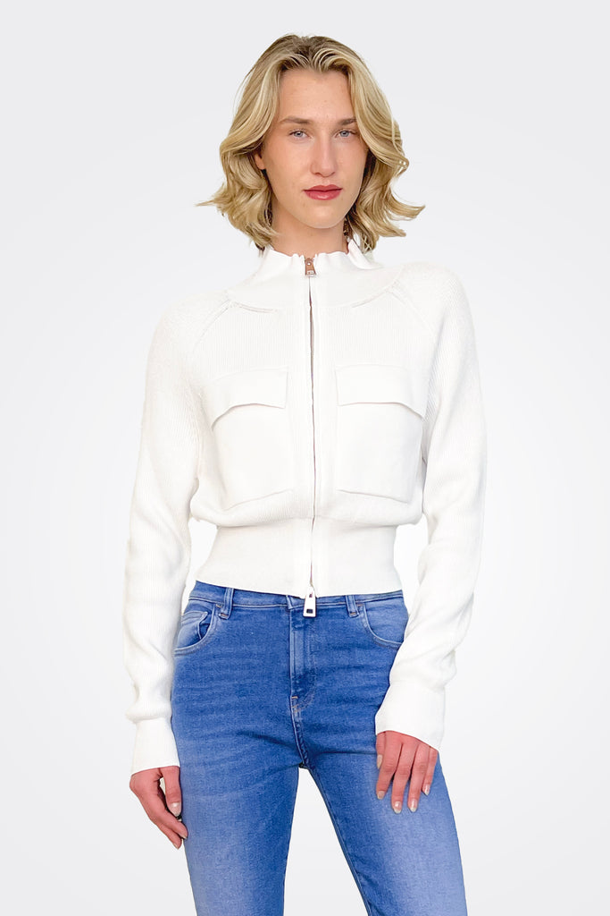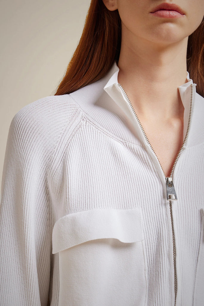 Ribbed stretch viscose cardigan, zip opening at the center front, high collar, raglan cut and long sleeves, front patch pockets with flap. Regular fit