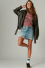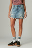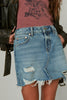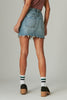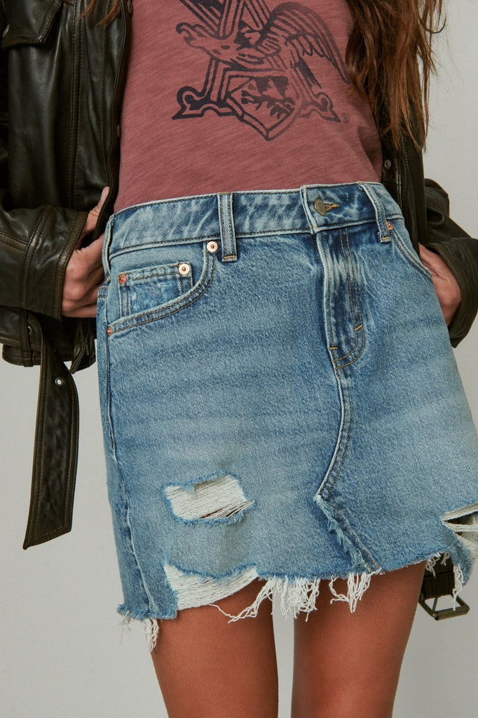 No wardrobe is complete with a denim skirt. Made from cotton with a hint of stretch, this mini skirt features an asymmetrical design at the front and back, distressed detailing and a raw edge frayed hem.