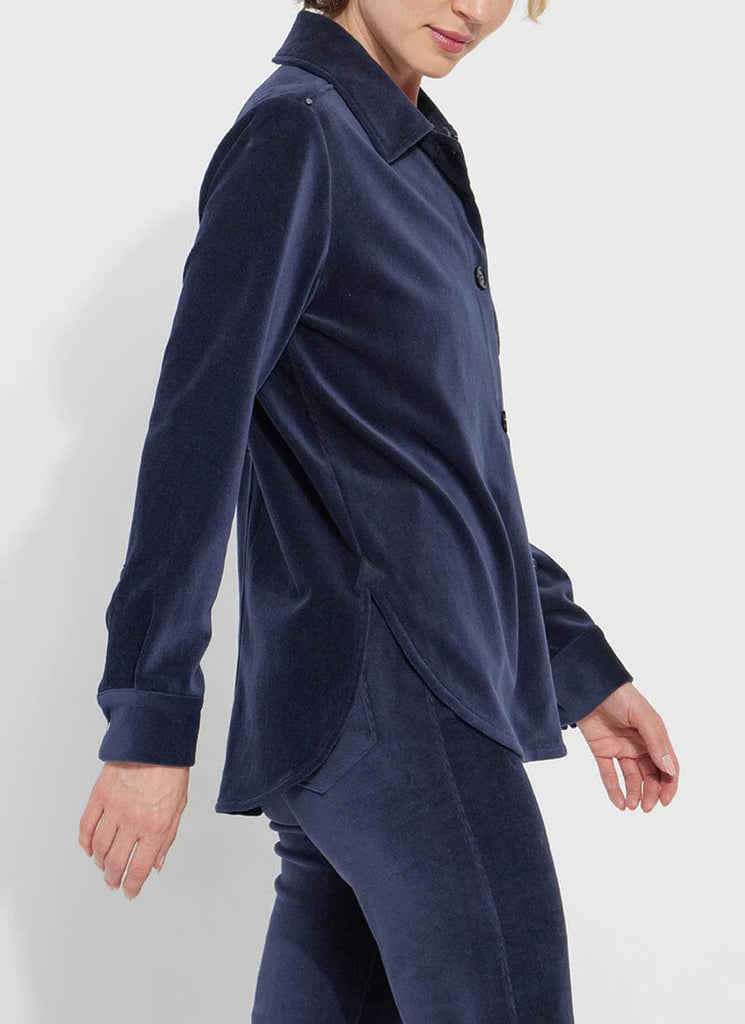 Offering a relaxed fit, side vents and a low, hip-length hem. Made from Stretch Baby Cord with Vegan Suede trim, it’s unlined with mesh at the inner yoke for ease of movement. Detailing includes a back hanging loop with high-shine gunmetal studs, Vegan Suede cuff facings, and a high-low hem with Vegan Suede bias binding.