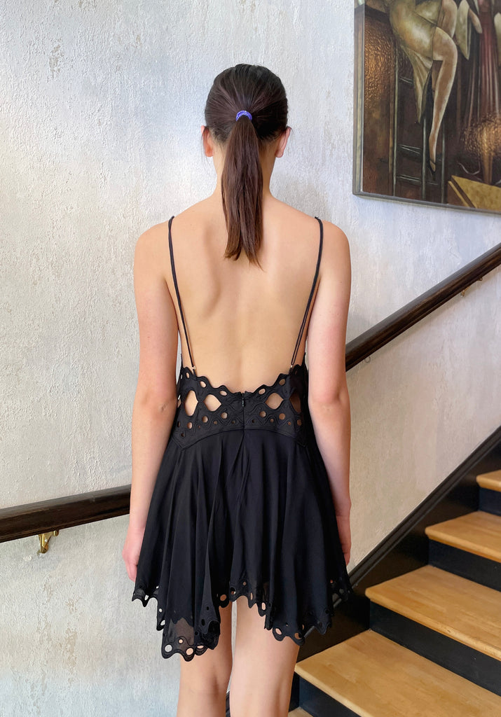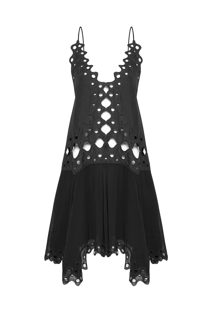 Crafted from Cotton Silk Viscose, the Cleo Dress sees Magali revisiting a best-selling style from season's past The sexy party dress features a dramatic open back, a high low lined skirt and exclusive cut-out embroidery.