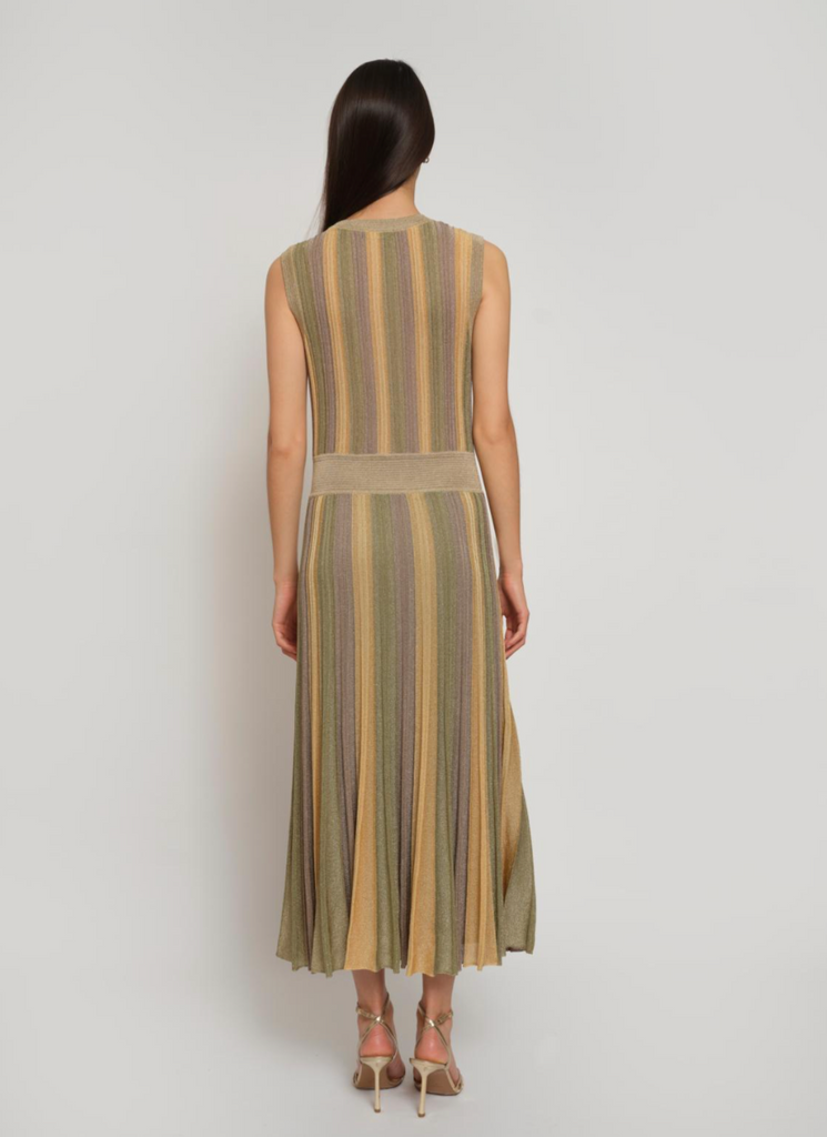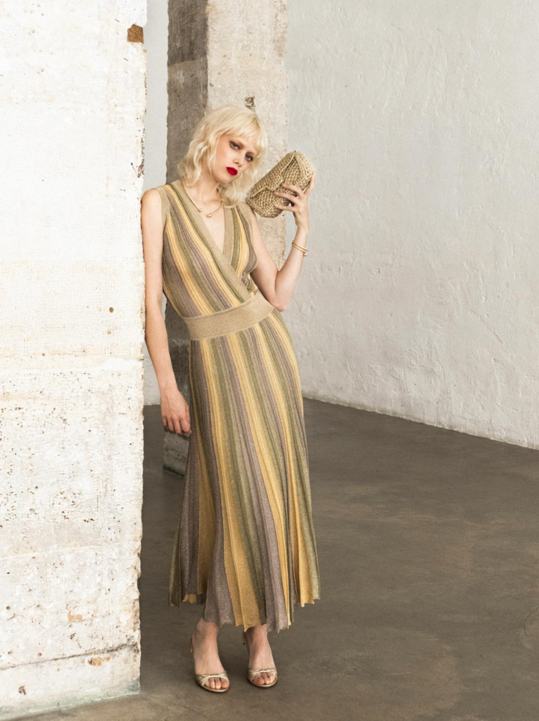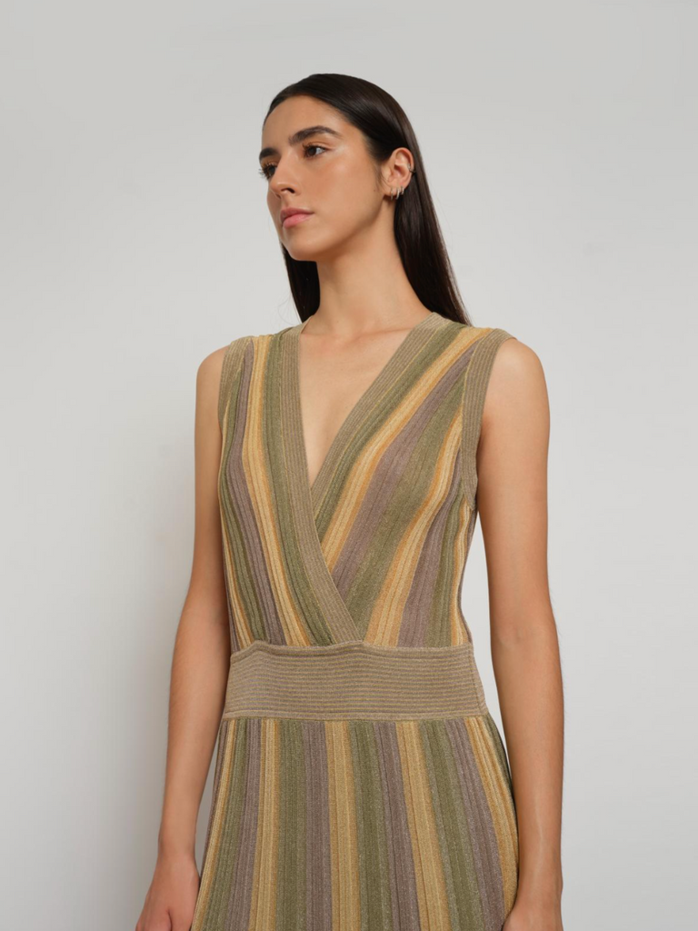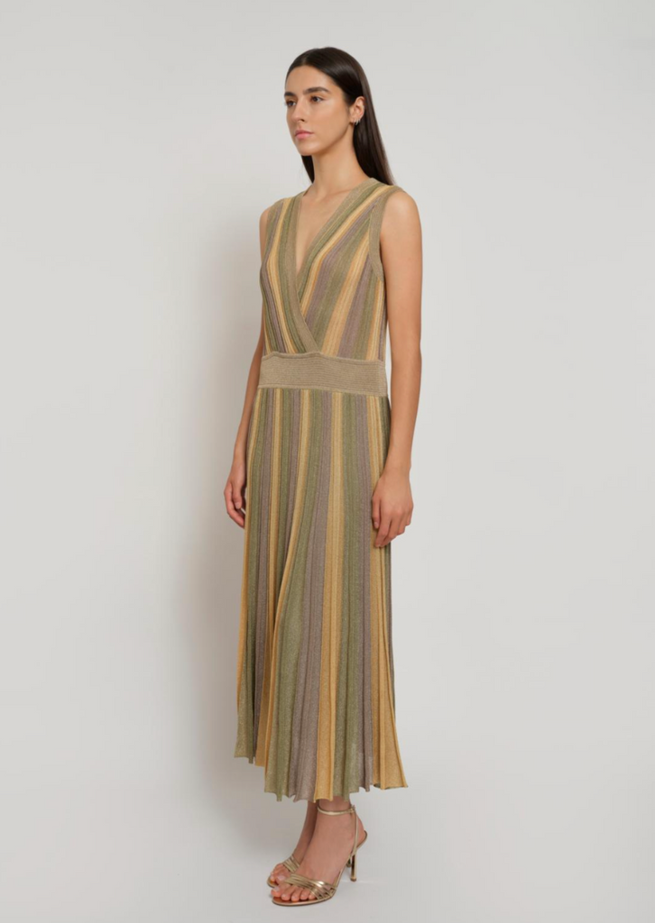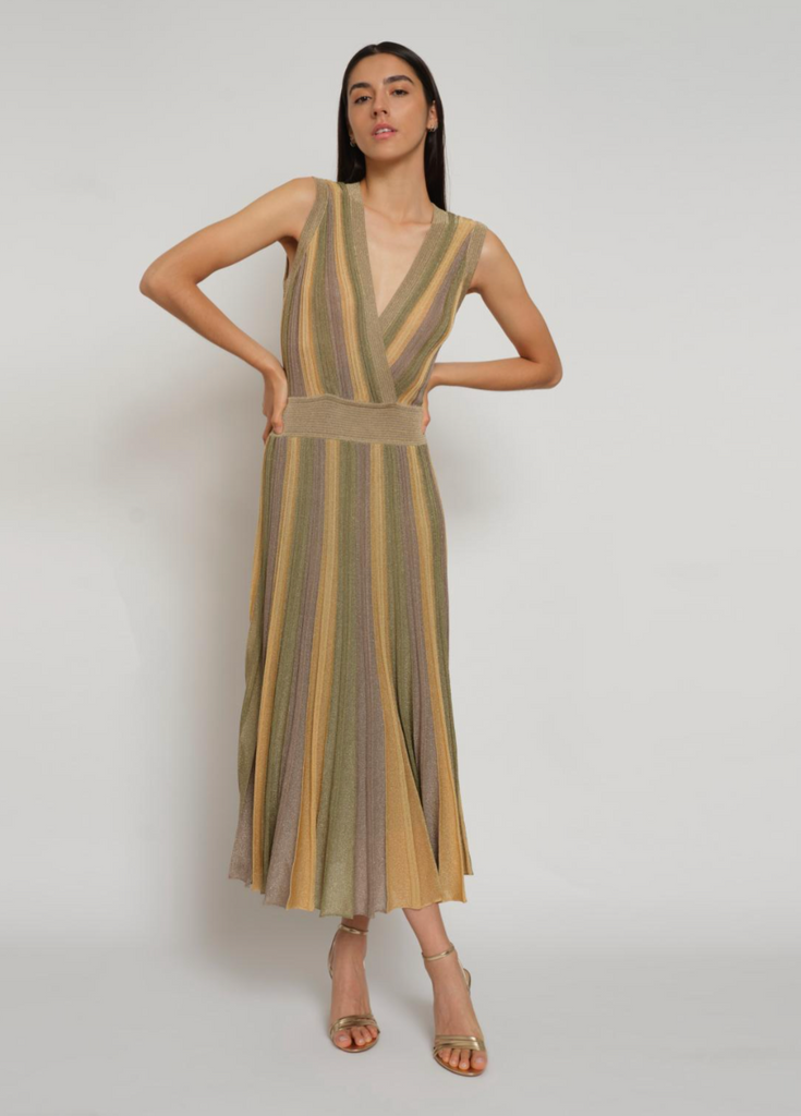 Long pleated tricolor dress in Lurex® knit, it has a wrap neckline and is elasticated at the waist.