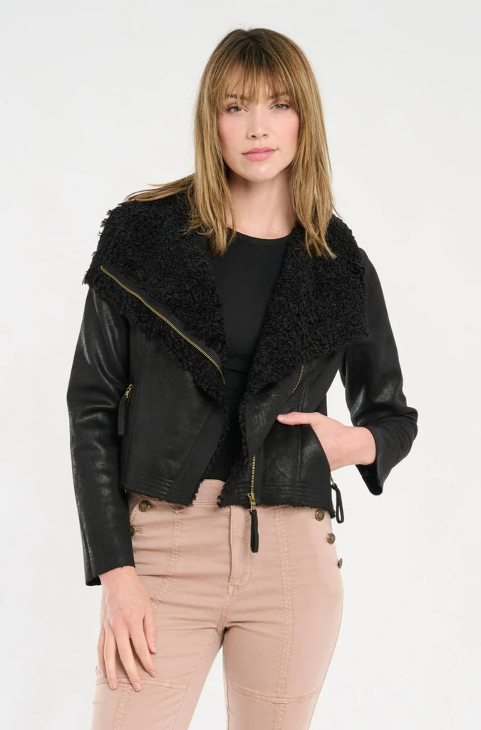 The Wylder is an asymmetrical moto jacket with vegan shearling. The high low hem line provides great coverage for chiller days along with the front zip pockets.