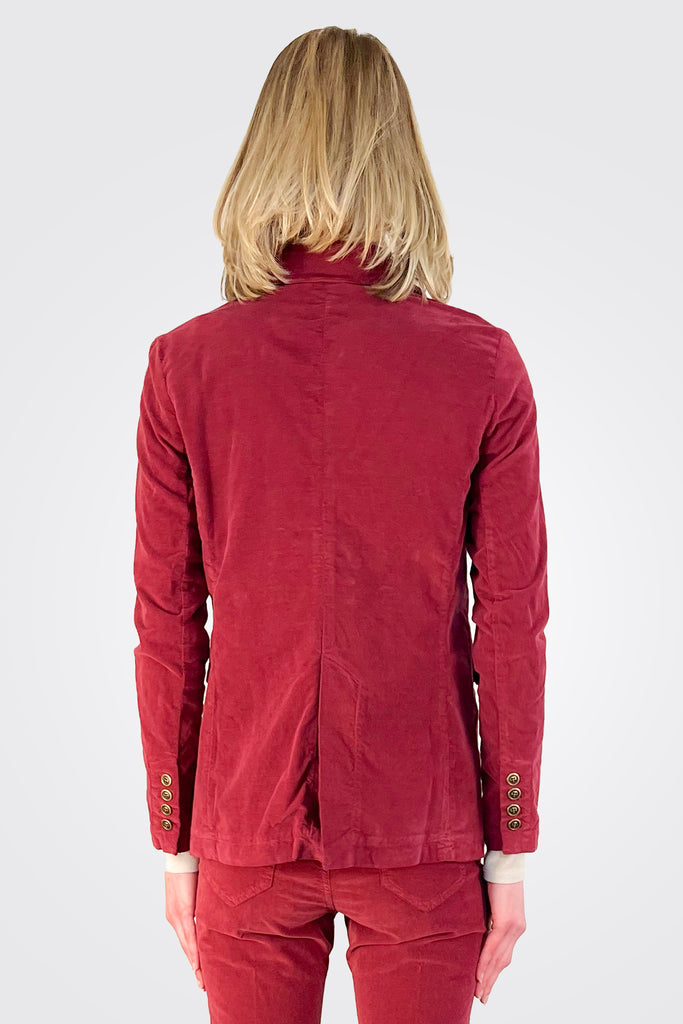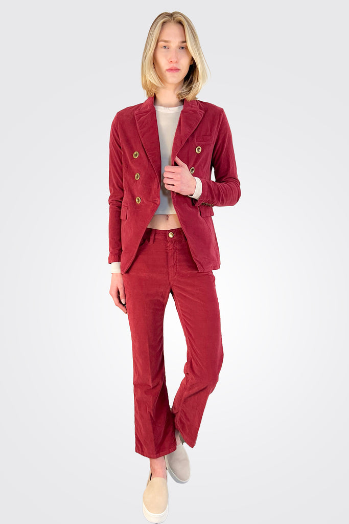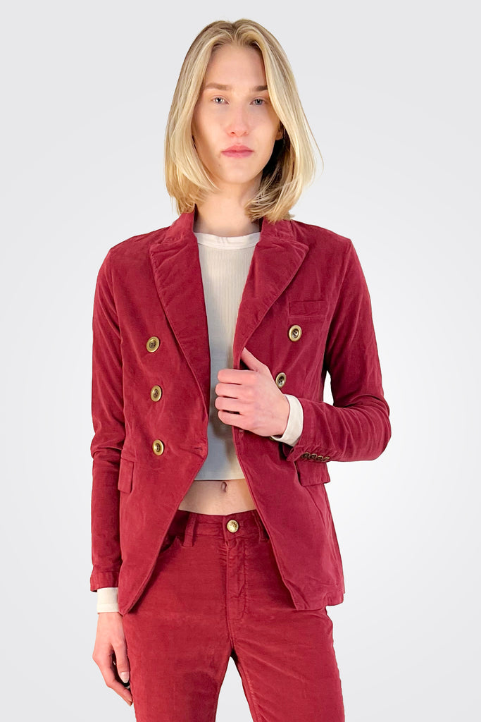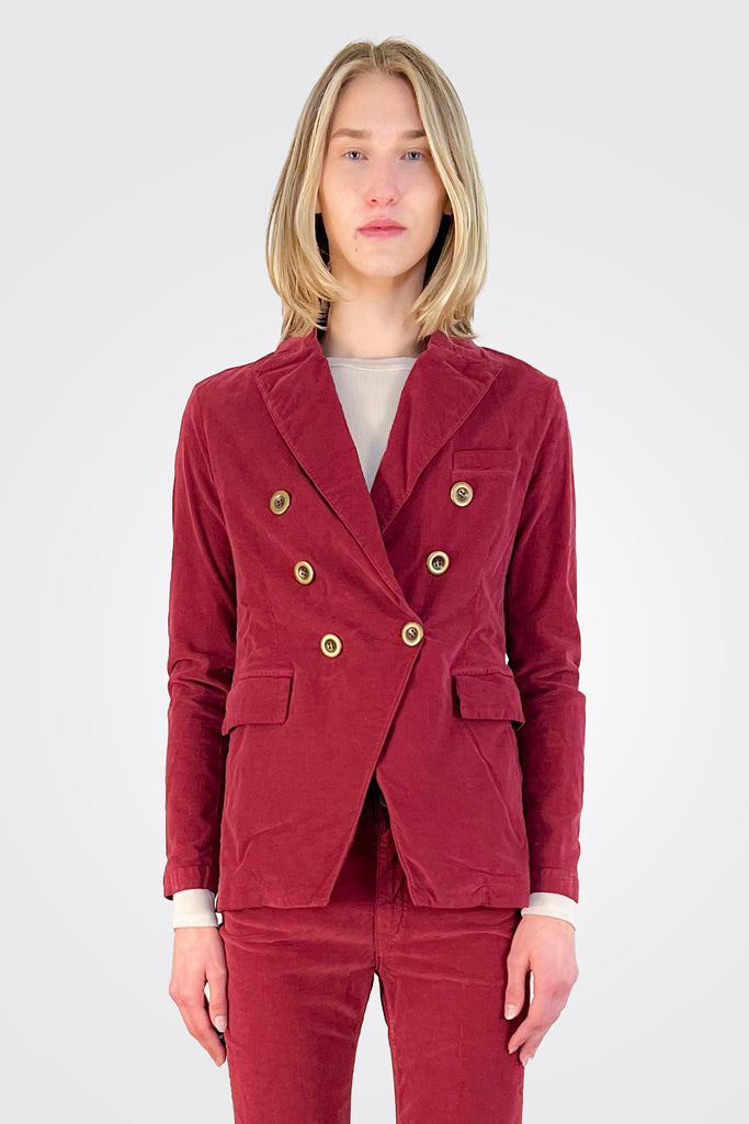 Mason's woman blazer in smooth velvet, model Caroline. The elegant women's jacket has a double-breasted closure, two flap pockets and a slit in the back. The Caroline velvet jacket can be worn with chino pants in the same colour and fabric, for a glamorous outfit ideal for the autumn-winter 2023 season on both formal and everyday occasions.