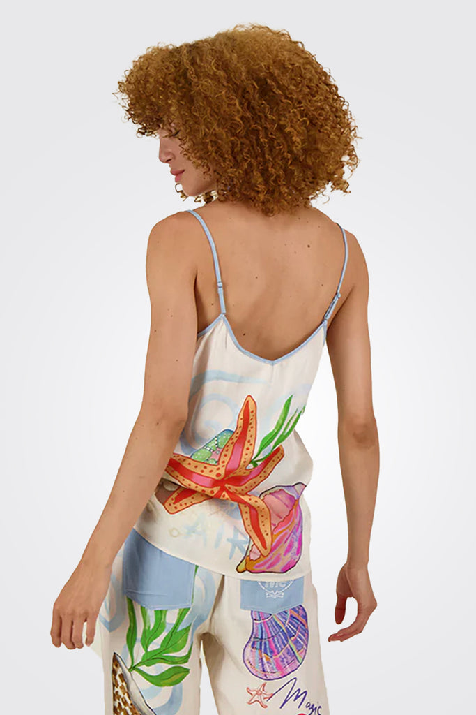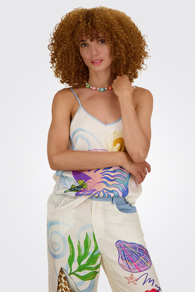 Ocean themed v-neck camisole. Front features a large shell graphic and reads “WATER”. Back has a large starfish graphic along with shells and plant life. Back says,”AIR”. Super cute with our matching pants or shorts.