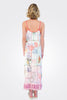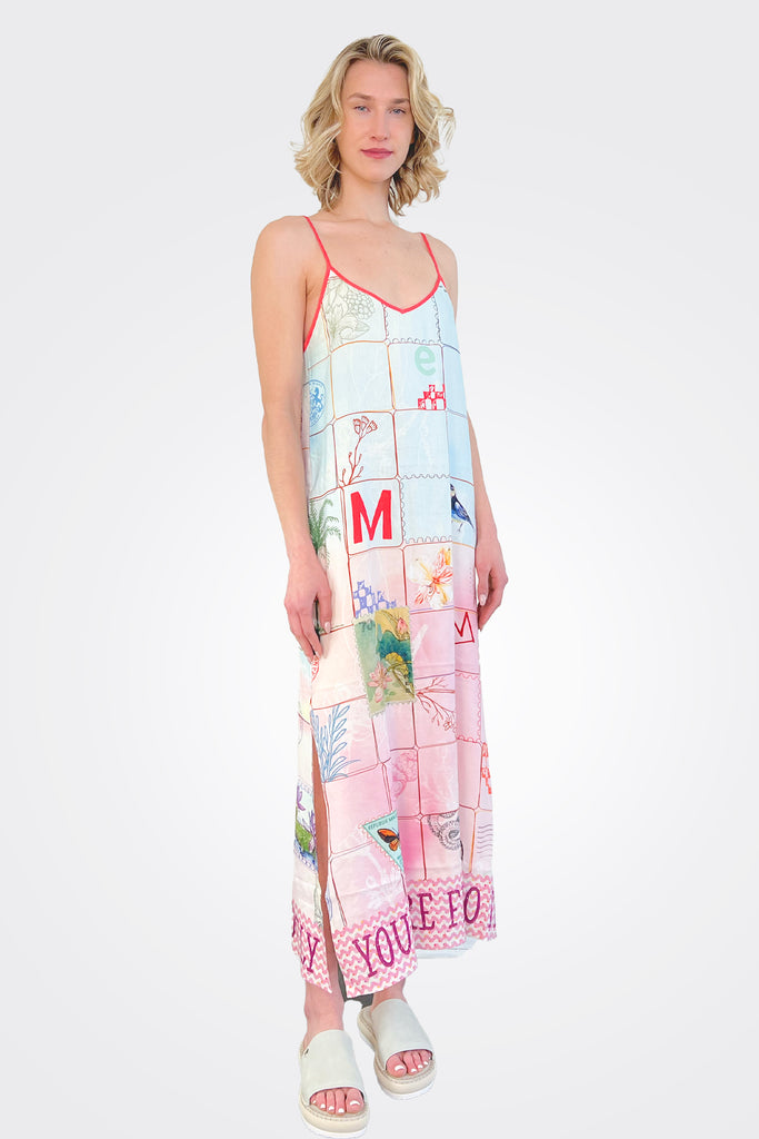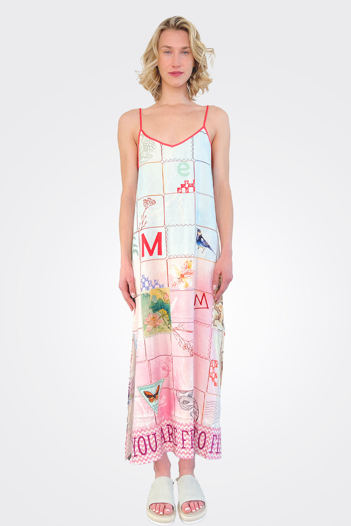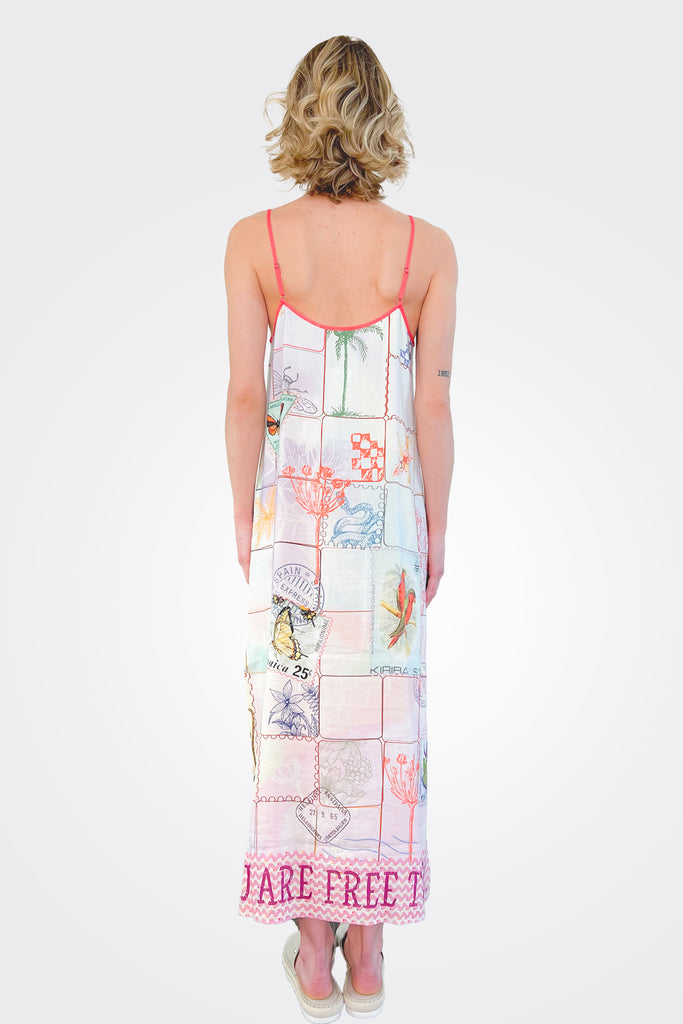 Sleeveless linen v-neck camisole dress with spaghetti straps and side slit. Geometric pastel print featuring animals and plants. Bottom reads “YOU ARE FREE TO FLY”on front and back. Wear this dress for a summery feminine look.
