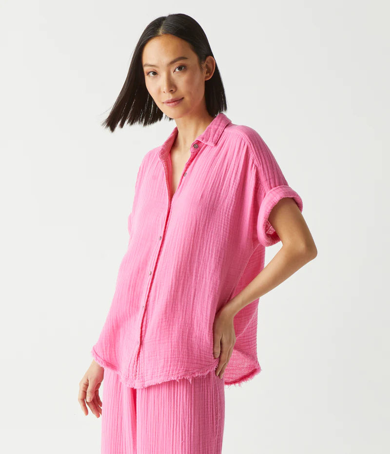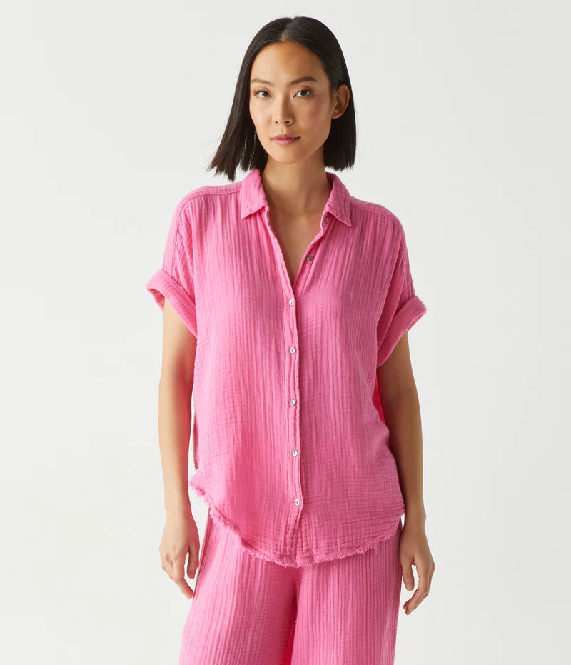 Effortless and light, Bailey has rolled short sleeves, a button up silhouette and a raw-edge hem with an easy fit. Made from our cool and airy double gauze that you'll live in all summer.