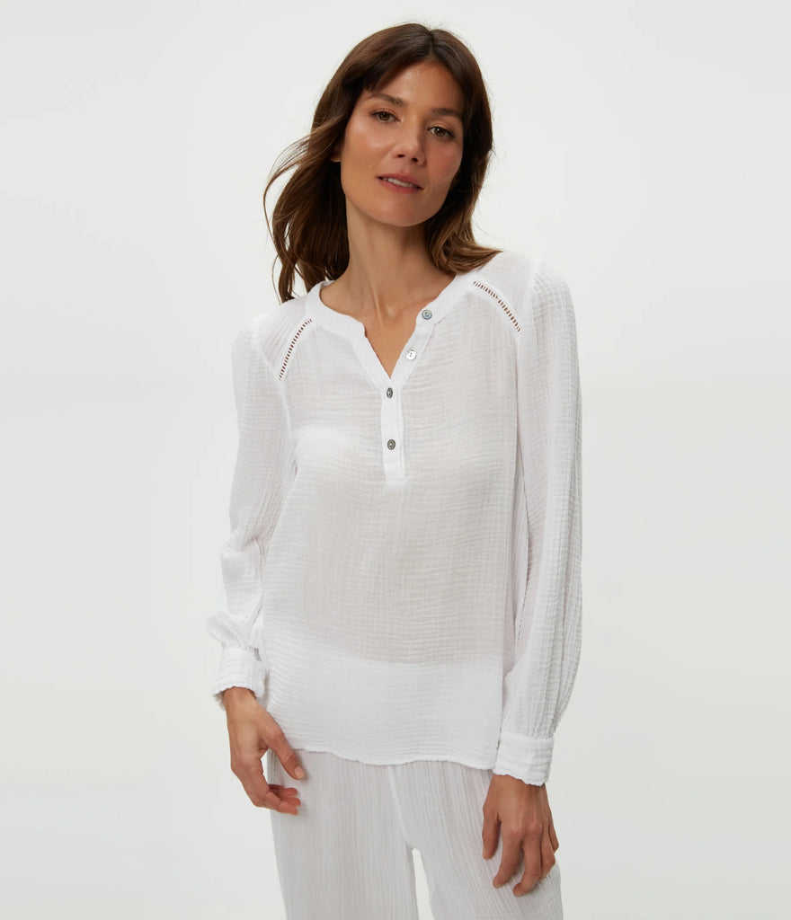 Classic and breezy this peasant top is a staple to your getaway wardrobe. With a partial button detail at the neckline and long sleeves giving way to a ruffle cuff, this top is comfortable, light, and a casual, easy essential.