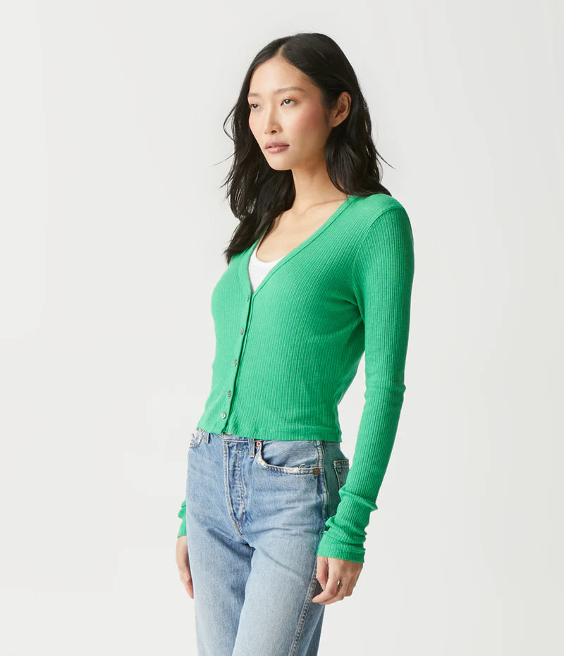 A fitted, v-neck cardigan, Lyla has shell buttons with long sleeves and a fitted silhouette.