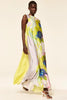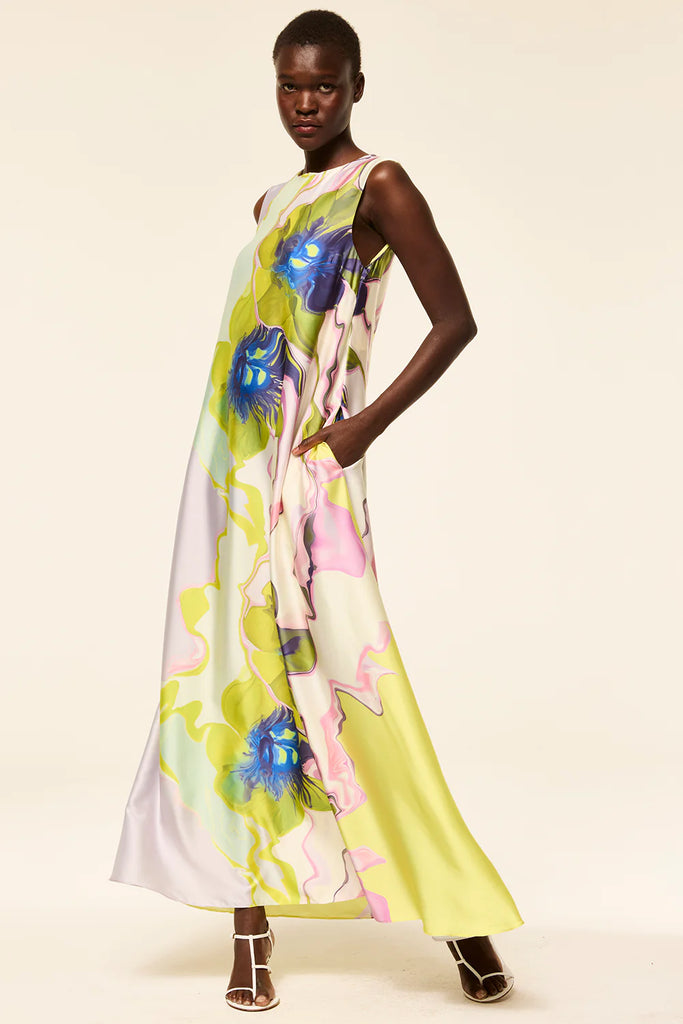 Sylvie dress is all things spring in a vibrant Marble Flora satin with a solid chartreuse back. This modern, flowing, sleeveless maxi dress features a high neckline with keyhole button-back closure. Pair with a simple heel or flat for a look that will carry you through the spring season and beyond.