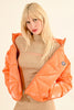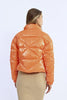 -Short and oversized down jacket-Quilted and topstitched-Iridescent effect-Tightened cuffs-High collar-Elasticated drawstring at the bottom of the garment-.Zip closure on the center front