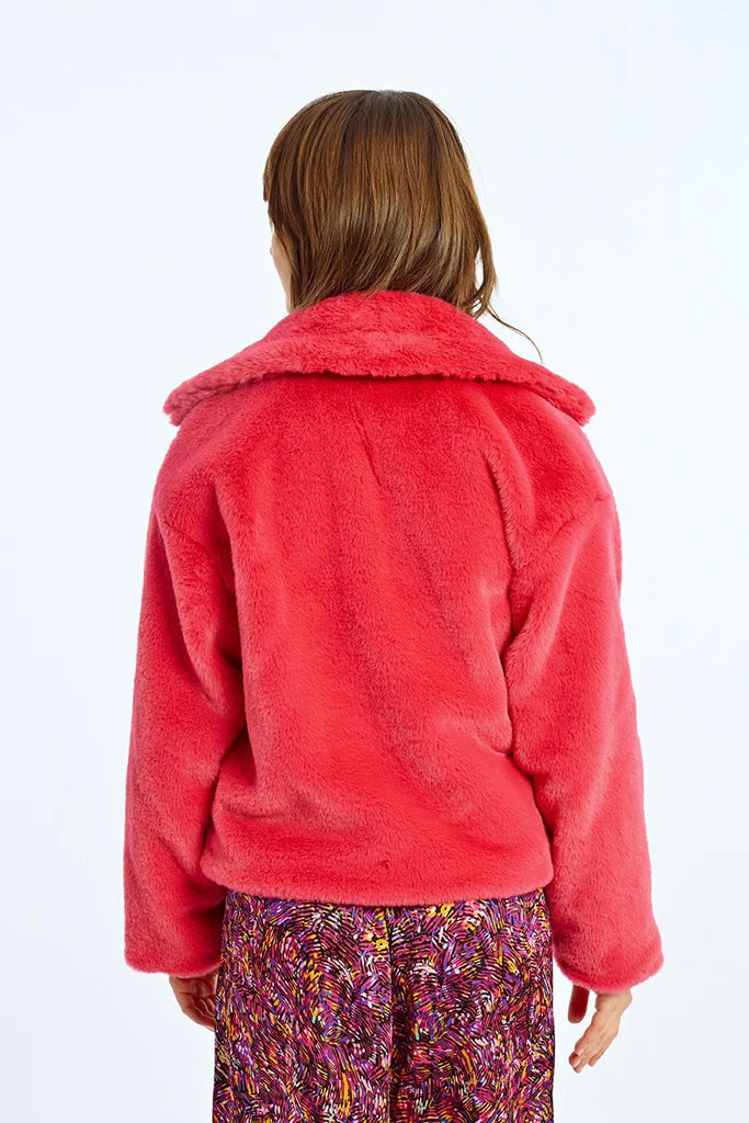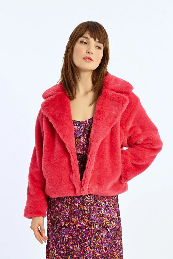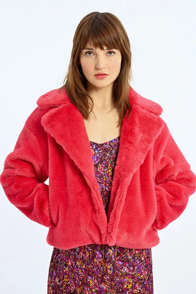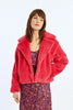 -Short textured imitation fur jacket-Wide lapel collar-Closure in the middle of the front with press studs-Soft to the touch-Side pockets-Oversize cut