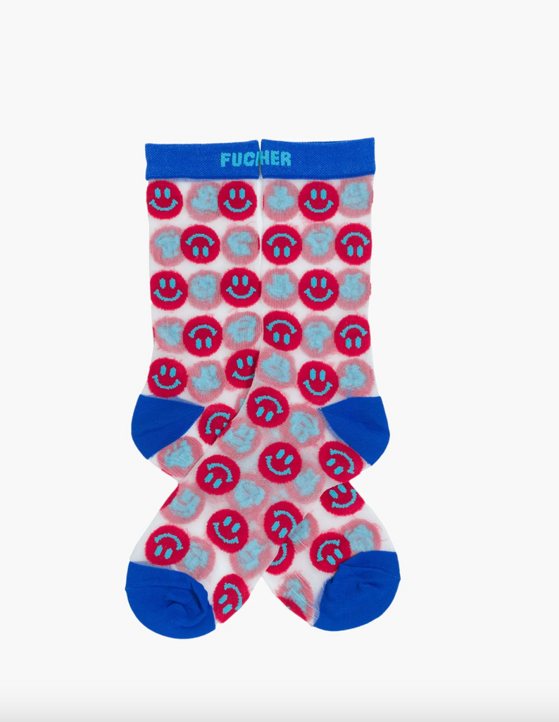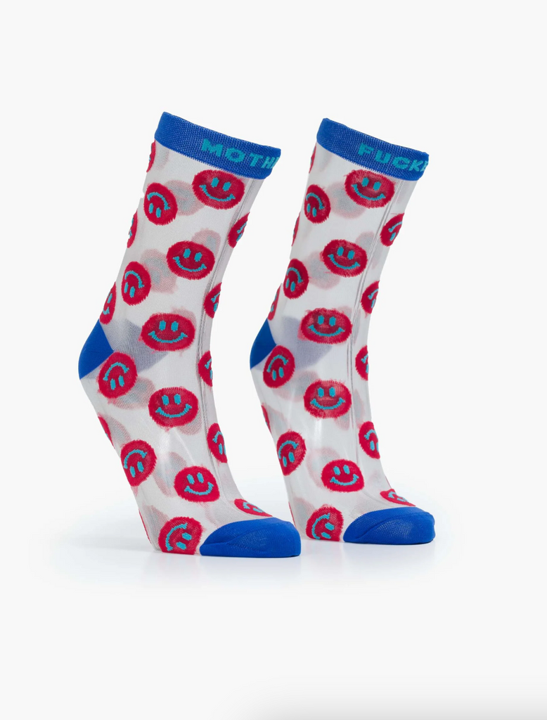 All the feels. Classic tube socks with an explicit message from MOTHER. The socks are designed in a translucent fabric with red smiley faces, navy trim and text in light blue.