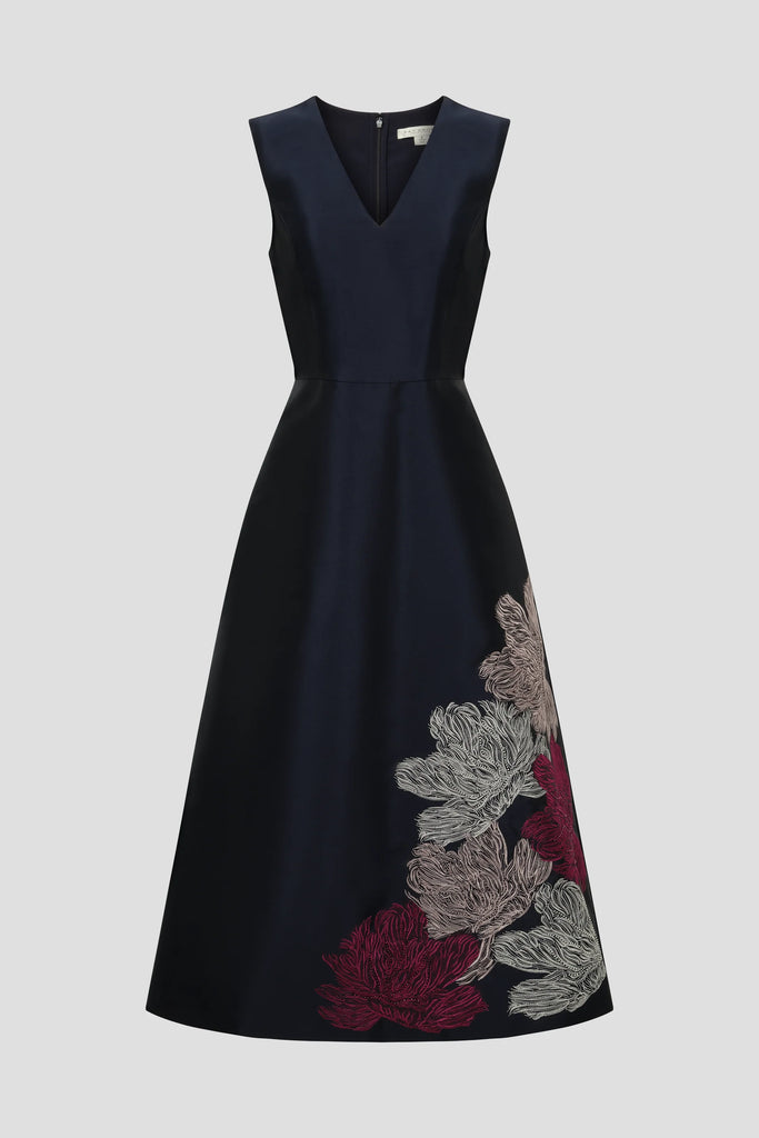 Softly structured taffeta dress that holds its shape without stiffness. Florals bloom along the skirt in embroidered detail with scattered beading, adding depth against the smooth base. A versatile statement for cocktail events, rehearsal dinners, mother-of-the-bride moments, and wedding guest celebrations.