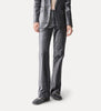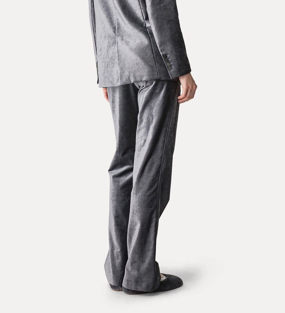 flared trousers in stretch velvet doused in a rich colour palette with an invitingly plush nap. the high waist and internal placket contribute to its pristine aesthetic while the leg drapes softly and naturally to the ground in a gentle pool. this sleek separate achieves a balance between fluid elegance and tactile appeal.