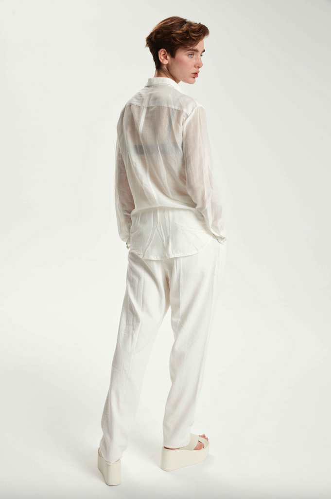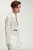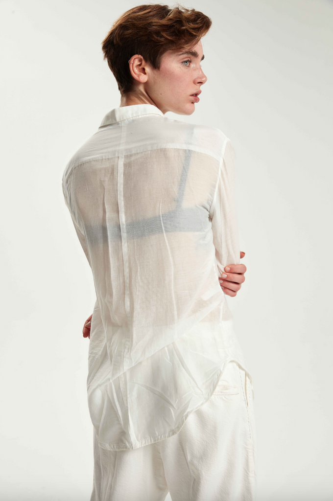The shirt, designed from silk and cotton blended voile fabric, is perfect. Regular form it has a concealed closure button placket. It is one of the beautiful examples of casual elegance with special patch work on the right front section with hand stitches. Pretty light weight