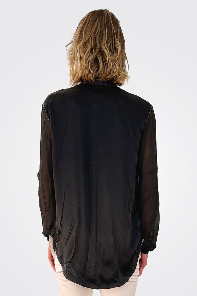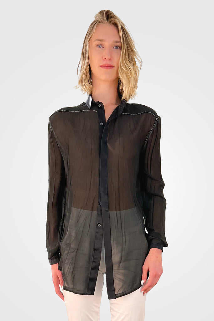 The shirt, designed from silk and chiffon and silk satin fabrics, is one of the best examples of stylish and casual designs of summer. Front part is silk chiffon, back part is formed from silk satin fabric. The comfortable and light weight shirt has concealed buttonhole and button work. It has more special look with hand stitching to the contour details. Thin sleeve cuffs and soft collar detail. You will love the soft touch of the washed silk fabric