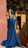 The glamorous sleeveless bodice flaunts a deep V neckline with sheer modesty inset while the back shows a cut-out style for a flattering vibes.