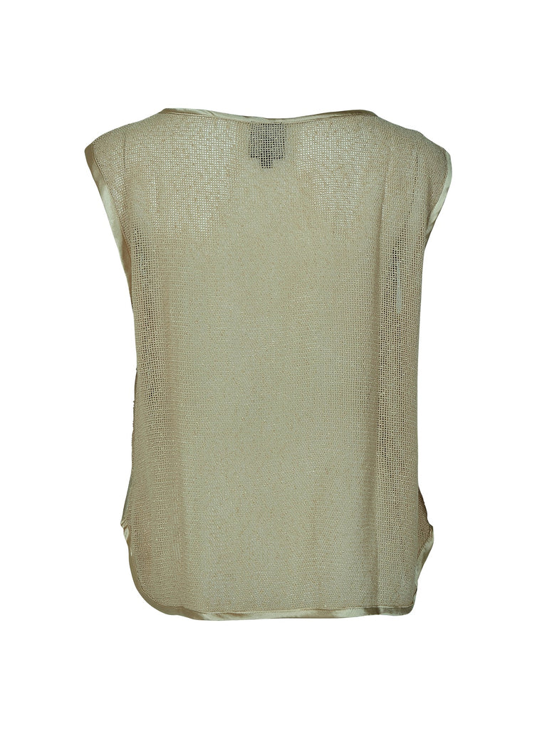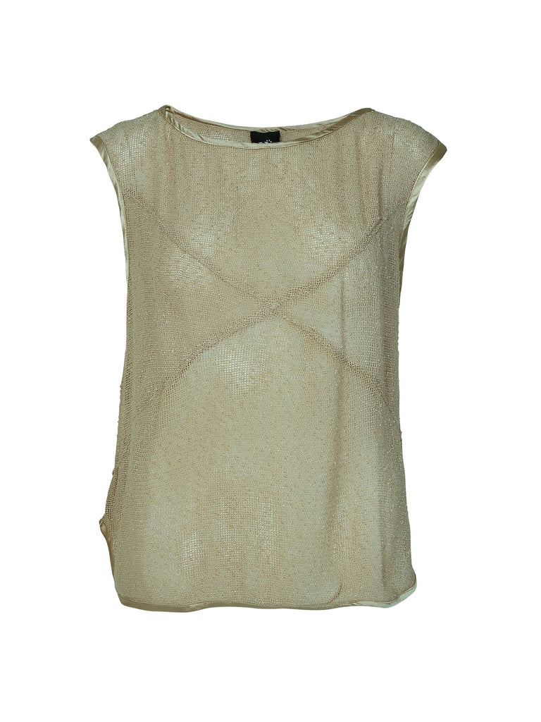 This top has a light transparent quality and a relaxed cut that gives an airy and elegant expression. The wide neckline and the fine satin ribbons along the edge add a soft contrast to the structured surface. The discreet front seams create a flattering effect.