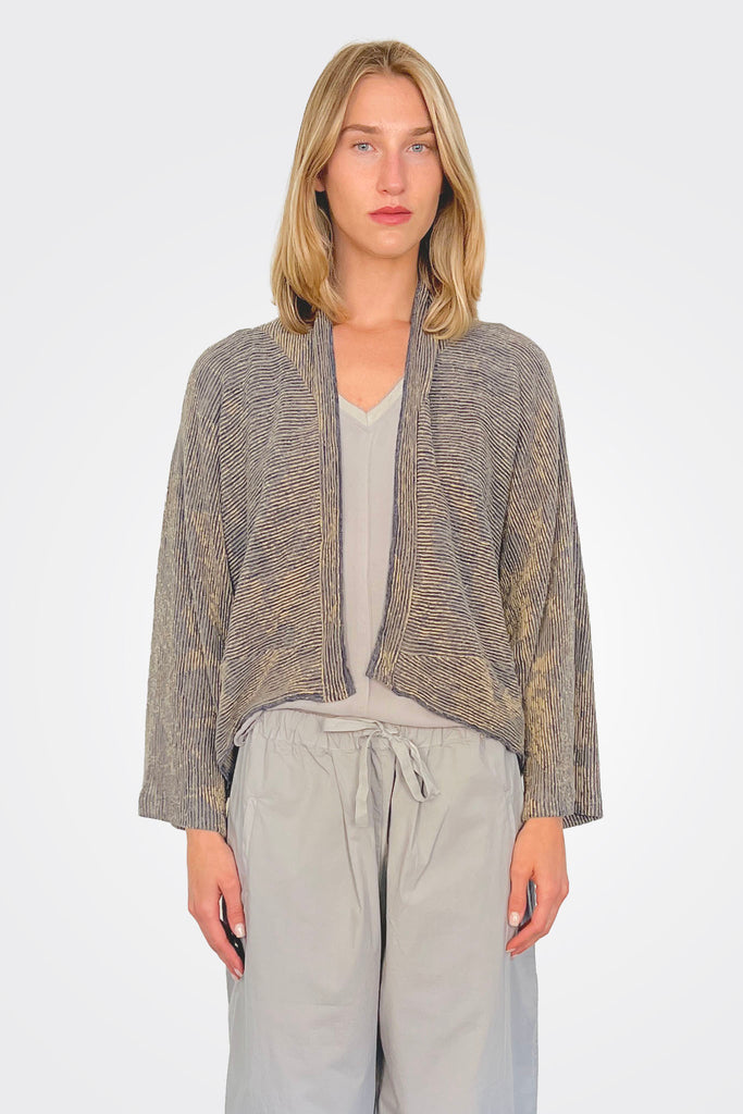 Featuring a soft lapel and a fluid silhouette, it drapes effortlessly for a flattering, relaxed fit. The richly textured fabric is brushed with painterly hues of yellow and blue, offering a unique, wearable statement piece
