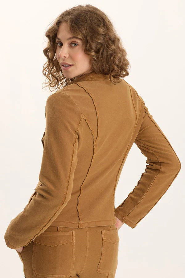 A fitted blazer in an unexpected Twill Knit, Dunne offers all the polish and classic silhouette of a blazer with plenty of unique elements, including a three-buttonn closure, flattering exposed seams throughout, a semi-cropped fit, and two envelope pockets at either hip. Cute as can be!