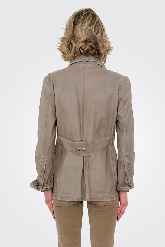 One of Jakett's most popular products, Meryl Washed Leather is a long utility jacket with cargo pockets and a back adjustable waist.