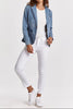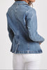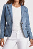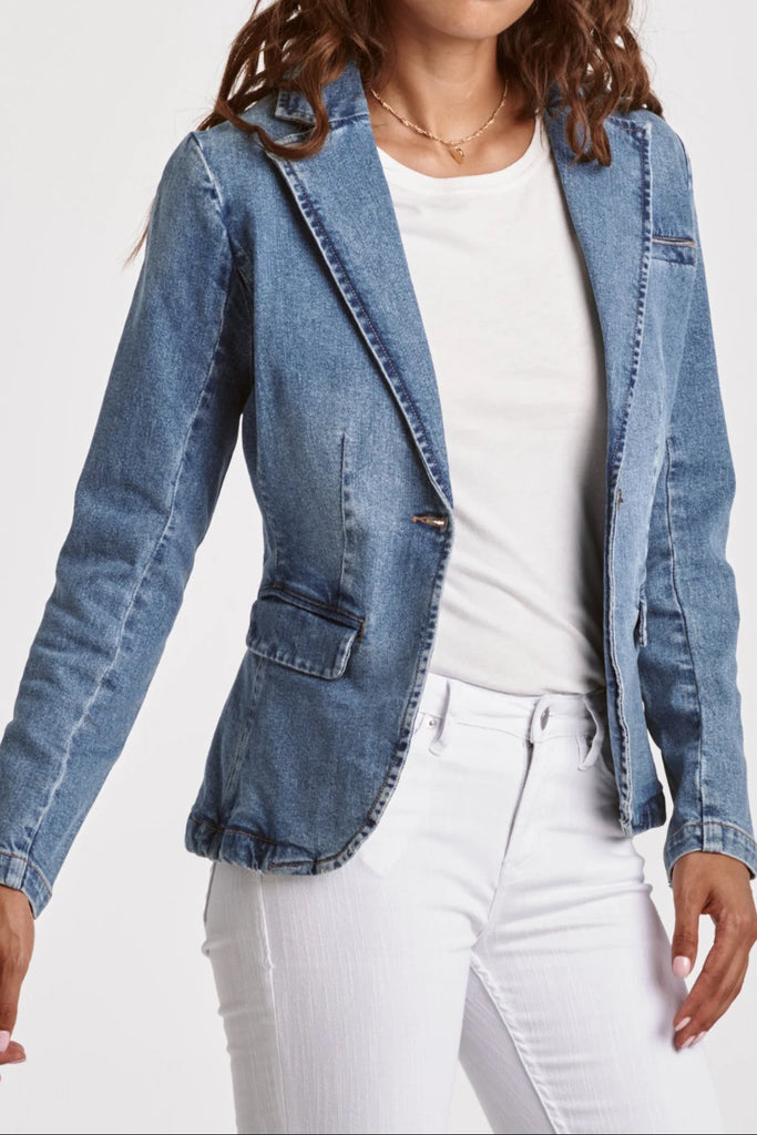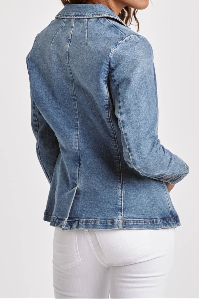 Denim blazer jacket, long sleeve with button closures, seams & center back vent, flap pockets & darts for shape support.