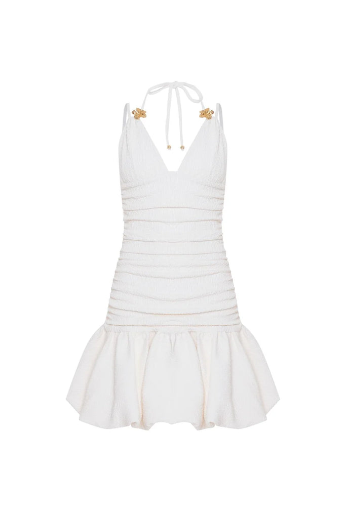 A touch of romance in every step. Crafted from lightweight jacquard, this short dress gently hugs the body, offering all-day comfort. The bubble ruffle skirt adds volume with charm and femininity, while the flawless fit brings a sense of lightness and grace. Perfect for those seeking elegance with a sweet, modern twist.