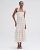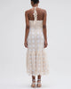 This midi dress features a floral lace square neckline with a slight halter floral strap design, a fitted crochet bodice that is fully lined into a flare pleated lace skirt. Neck tie and exposed zipper closure.