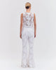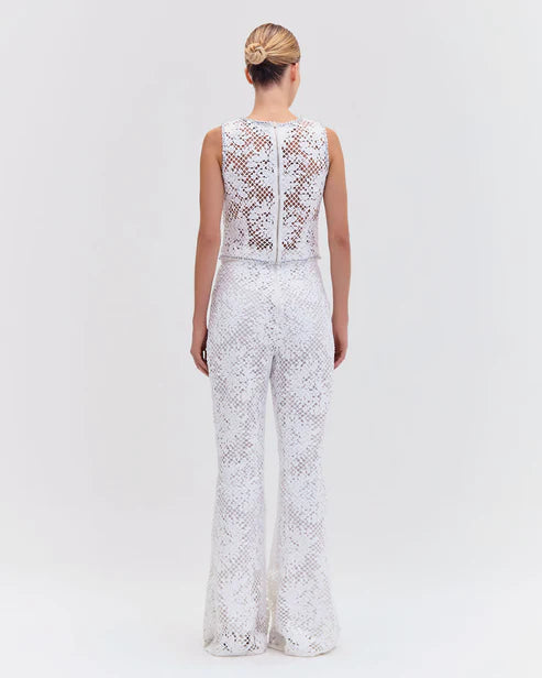 This tank top style top features a lace design with hand beaded detailing throughout. Styled with our Lace Wide Leg Pant. Exposed back zipper closure.
