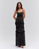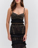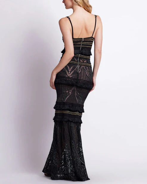 This Maxi Dress features a fit to flare style with lace and woven trim throughout, a sweetheart neckline with fringe detailing on the skirt and full lace bottom. Adjustable straps and an exposed back zipper detail. Runs true to size.