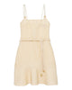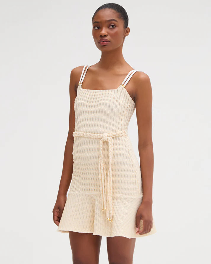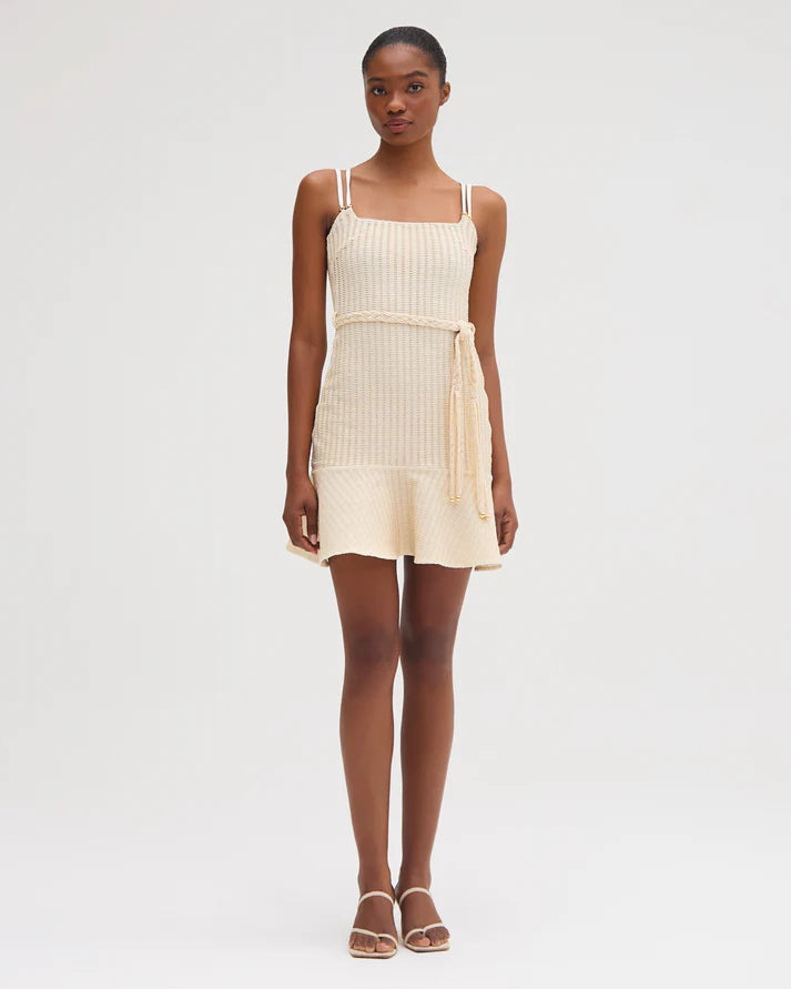 This mini dress features a knit material with a fit to flare design and a braided belt detail. Double to single adjustable straps