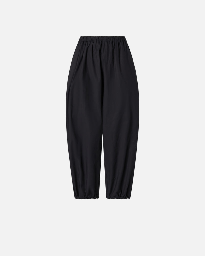 Women's long, relaxed-fit trousers in lightweight cotton poplin with very rounded balloon legs and drawstrings at the bottom that allow you to tighten and adapt the fit and give you two different leg shapes to choose from. The elasticated waistband and side pockets provide extra practicality. Lightweight and versatile, these poplin balloon-fit trousers are suitable for both special occasions and everyday looks, ideal for those in search of a striking, dynamic piece.