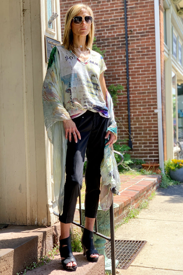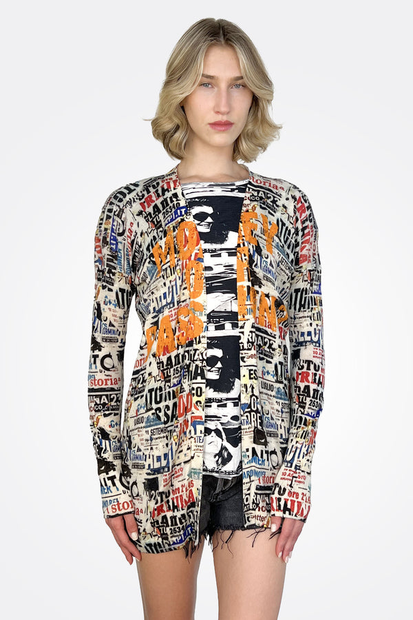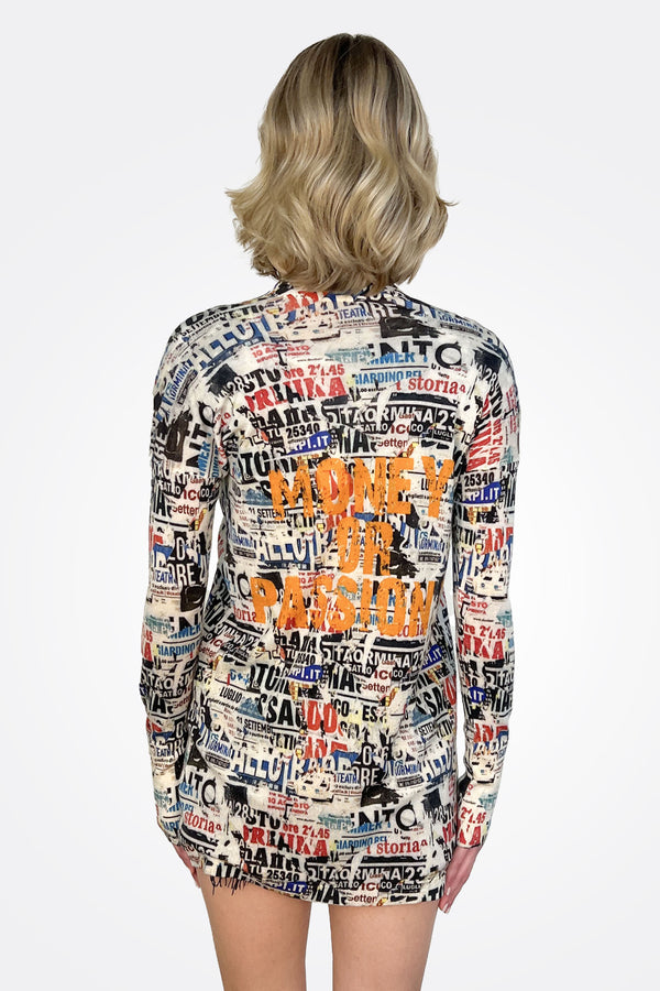 Boldly printed long-sleeve tees in organic linen blends bring artful flair to relaxed silhouettes, while oversized shawls double as statement accessories or wearable art. From “Rock Tickets” crewneck sweaters to “Money or Passion” cardigans, each design weaves narrative into fabric—fashion you can read at a glance. As for the maxi slip dress? Think fluid silk with graphic pop art dancing across the panel, perfect for when you want to make an entrance.