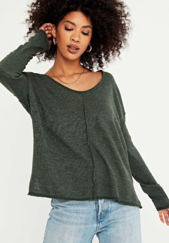 Slouchy oversized fit, wide scoop neck, center seam details and raw edging throughout; this top is perfect for layering.